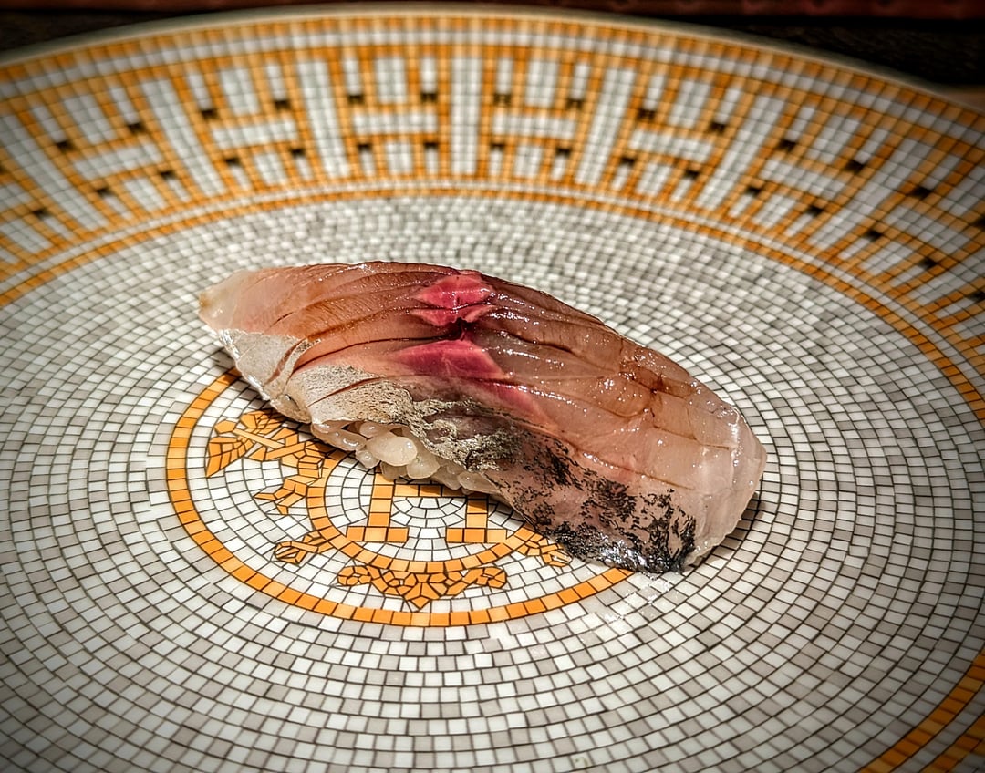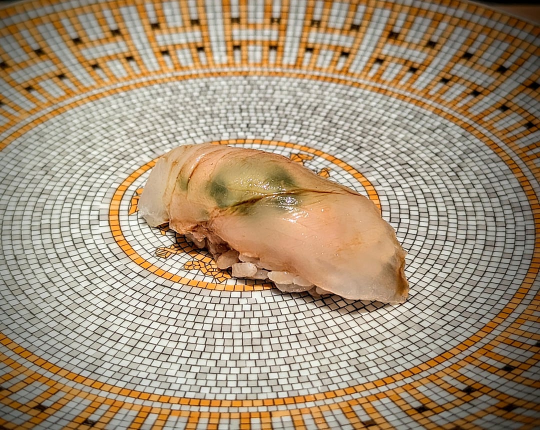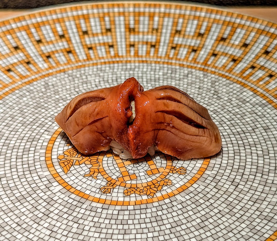 With this air of celebration comes a certain boisterousness, especially when coupled with the seeming predilection for luxury; Sushi Takamitsu is veritably festooned with luxury trappings. LV luggage sits atop the counter, acting as plinths for the excellent ingredients that Takamitsu-san is rightfully proud to show off. The plates are from Hermès while the glassware is Baccarat. All of this can attract a certain crowd, and this was also in evidence during my sitting; talks of Dubai wafted like noxious fumes through the 11-seat restaurant at times, but hey, that's their prerogative. For my part, Takamitsu-san was very happy to talk (largely through a translating member of staff) about his knives, which are truly beautiful blades. I mention this because, if a noisy counter really isn't your thing, then be aware that Sushi Takamitsu does not hold itself in quiet contemplation like many other sushiyas.