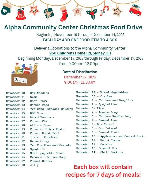 SIDNEY — The Alpha Community Center, located at 950 Childrens Home Road, Sidney, will collect food for their Christmas food drive Dec. 15-17 from 9 a.m. to noon.