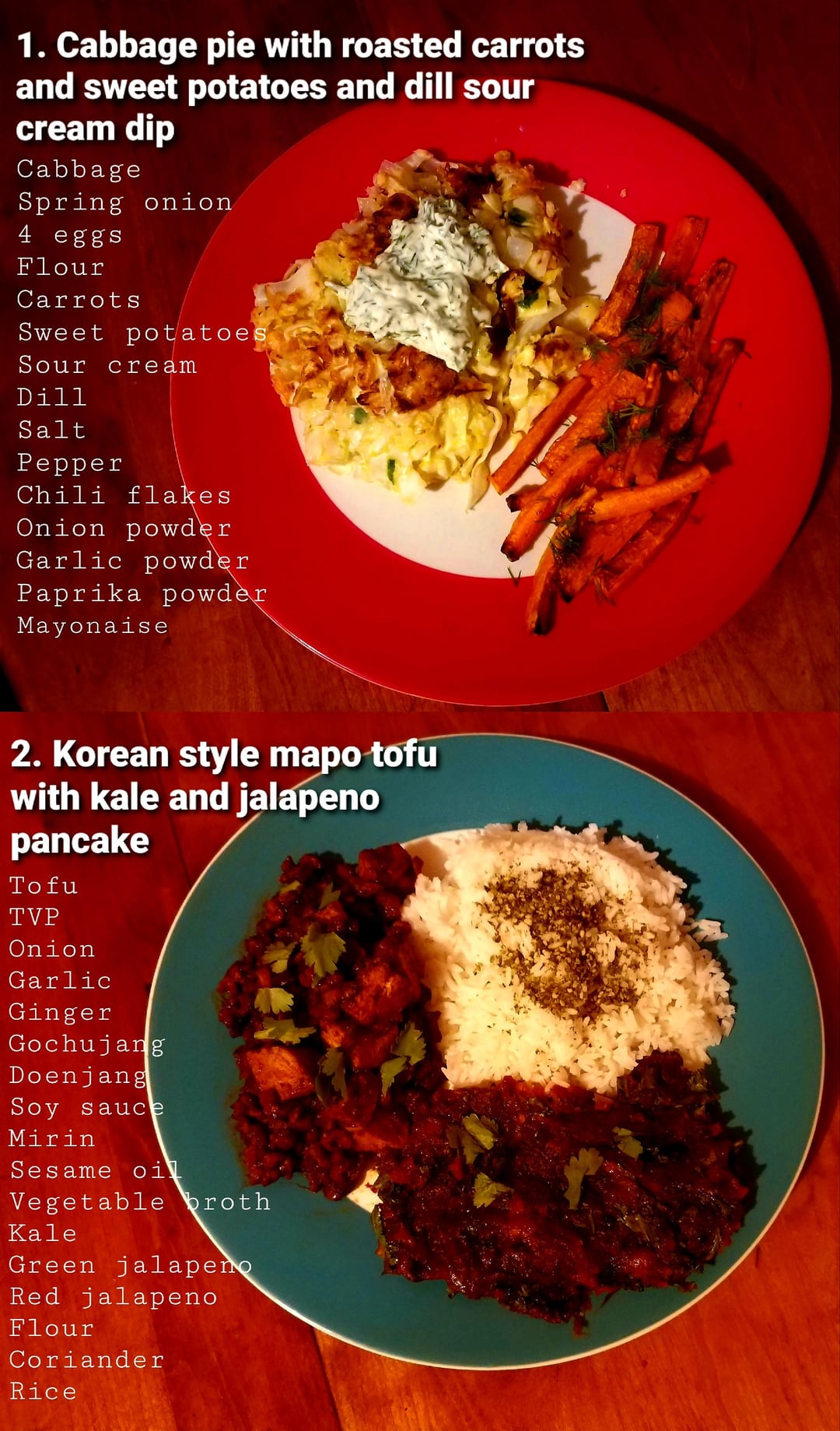 1. Cabbage pie with roasted carrots and sweet potatoes and dill sour cream dip. For the pie, mix in shredded cabbage, spring onion, a bit of flour, eggs, salt, pepper, garlic and onion powder. Cook the pie in a pan about 7-10 min each side. Parboil the sweet potatoes and mix in salt, pepper, paprika powder and melted butter with the carrots and sweet potatoes. Bake in the oven at 220°c for 10-15 min. Mix chopped dill, sour cream and mayonaise for the dip.