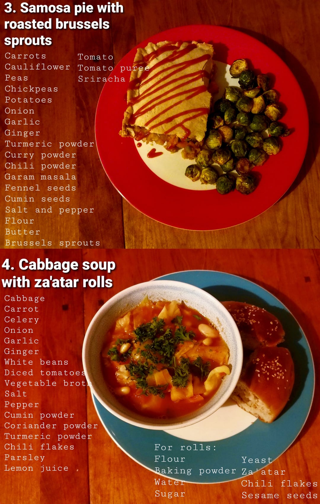 3. Samosa pie with roasted brussels sprouts. For the pie crust i made shortcrust pastry by combining butter and flour (1:2) and a bit of water and salt. Let it cool for 20 min. For the filling, mash the potatoes and cook the fennel and cumin seeds in a pan. Add onion, garlic and ginger then add tomato puree, tomatoes and spices before adding vegetables, peas, chickpeas, water, salt and pepper. Cook for 15-20 min. Add mash and assemble the pie. Bake in the oven at 180°c for 50-60 min. For the roasted brussels sprouts, mix in curry powder, salt, pepper and paprika powder with oil and brussels sprouts and roast for 15 min.