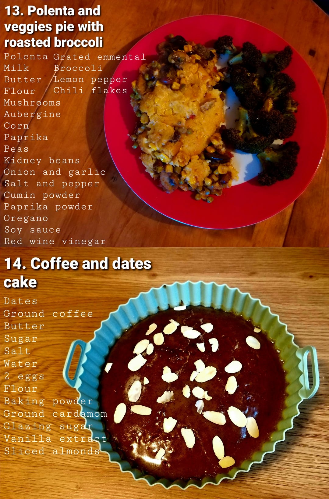 13. Polenta pie with roasted broccoli. Pan fry the aubergine and mushrooms until golden. Take them out and cook the onion, garlic, jalapeno and veggie mix in the pan. Add tomato puree, cumin powder and oregano. Mix in aubergine, mushrooms, diced tomatoes, vinegar, kidney beans, salt, pepper, paprika powder, soy sauce and water. Heat milk and butter separately, mix in creamed corn. Whisk in polenta, salt and pepper. Assemble the pie and bake in the oven at 180°c for 30-40 min. Roast the broccoli with oil, lemon pepper and salt for 15 min.