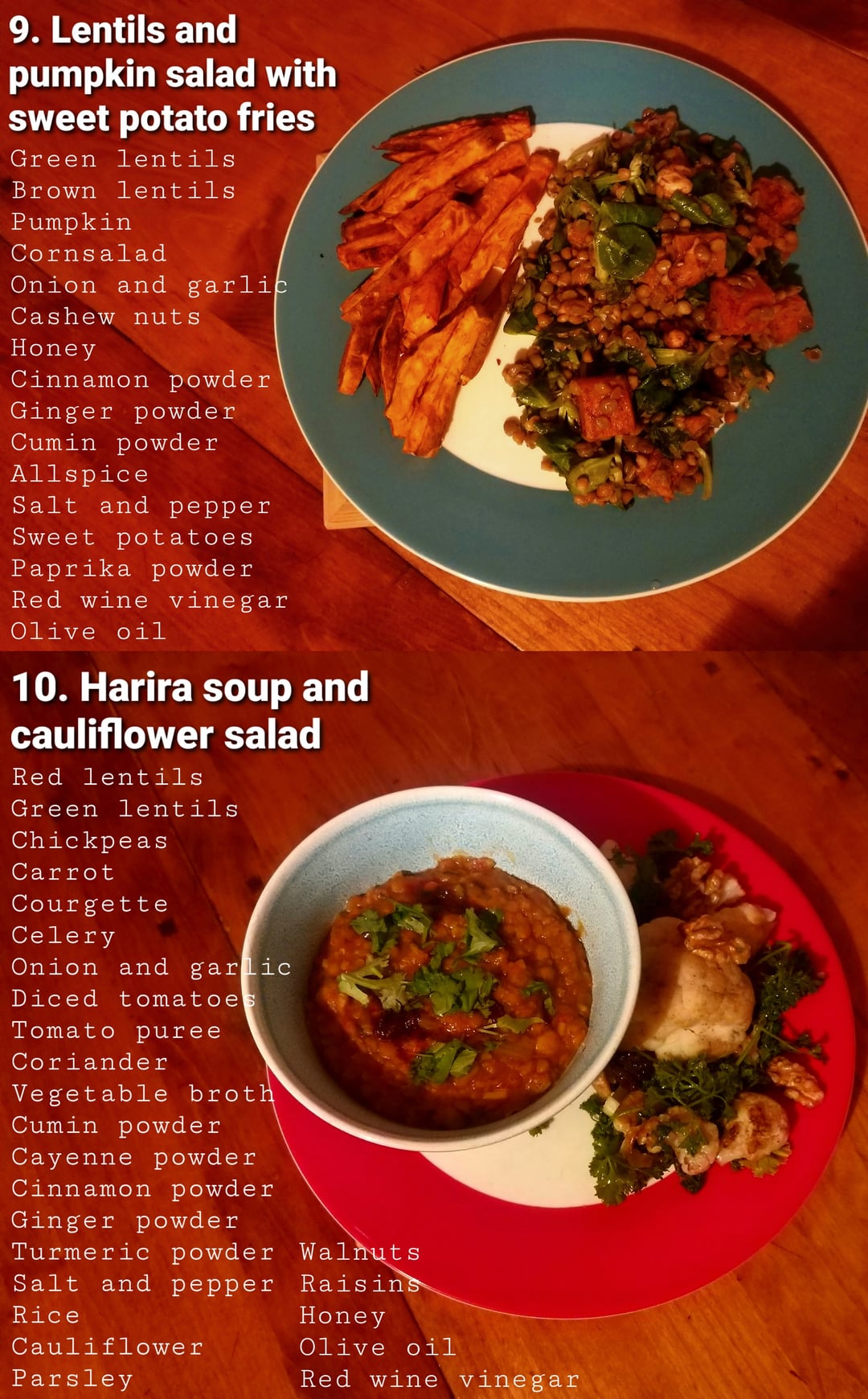 10. Harira soup and cauliflower salad. Cook onion, garlic, courgette and celery in a pan. Add in salt and the spices, then add in diced tomatoes, tomato puree, coriander, lentils and chickpeas. Cook for 5 min. Add in veggie broth and bring to a boil, turn heat down and simmer for 45 min. Stir in rice and cook for 15 min. For the salad, toss cauliflower with oil, salt and pepper. Roast in the oven at 220°c for 20 min. Assemble salad with parsley, cooled cauliflower, celery, walnuts and raisins. Mix well with cinnamon, allspice, salt and pepper.