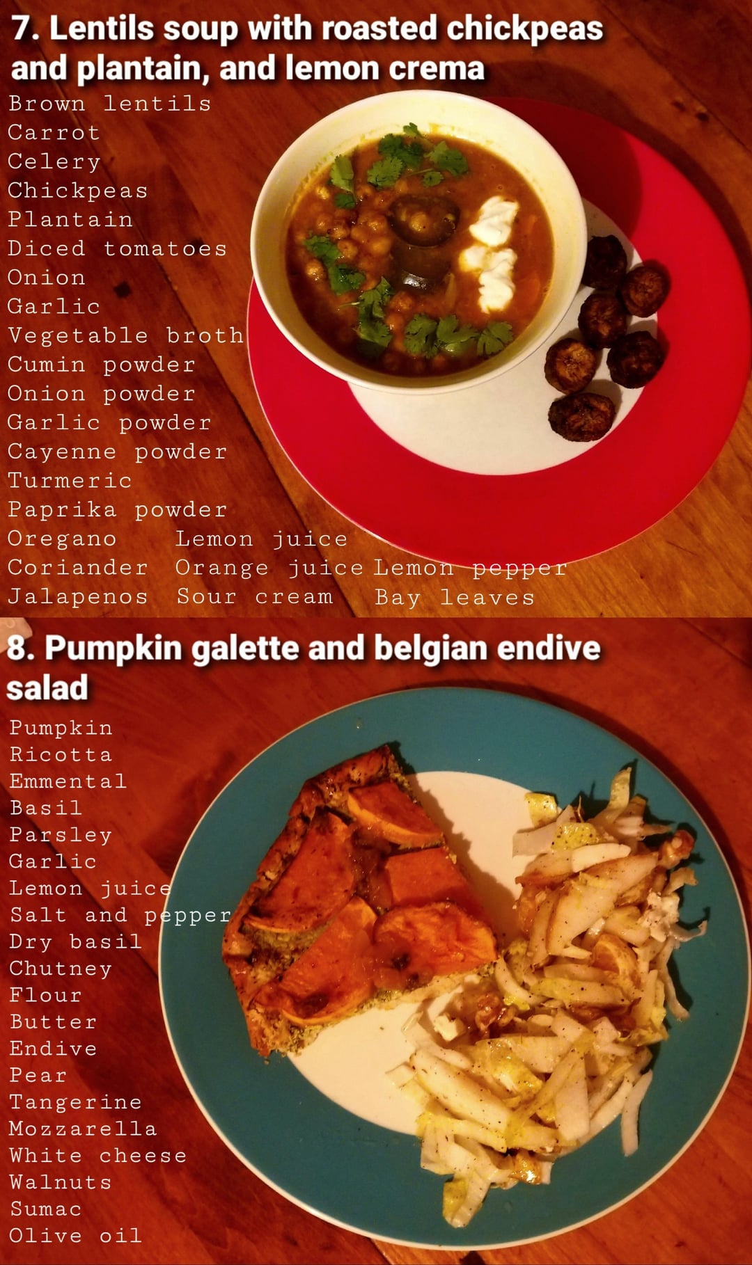 8. Pumpkin galette and belgian endive salad. Mix spring onion, basil, parsley and garlic with lemon juice, ricotta and emmental. Add in salt and pepper and mix until smooth. Roll out shortcrust pastry and prick with fork. Spread the ricotta herb mix, leaving 3cm on the side free. Put sliced pumpkin on top. Fold the sides in and brush with olive oil and dry basil. Bake in the oven at 200°c for 40 min. Top with chutney. For the salad, core and soak the endives in cold water for 30 min. Combine endives with clementine and pear slices, toasted walnuts and mozzarella. Toss in the dressing of garlic, lemon juice, salt, pepper, sumac, honey and olive oil.