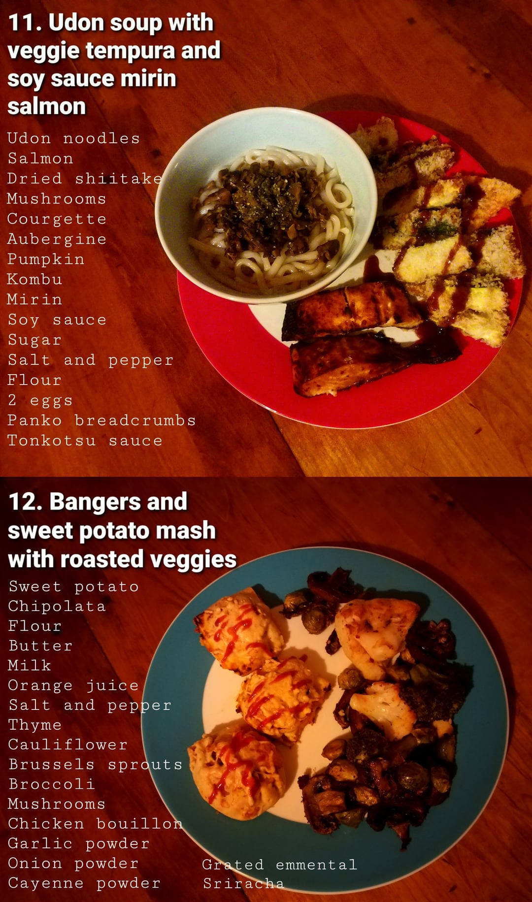 11. Udon soup with veggie tempura and pan fried salmon. To make broth, mix water, kombu and dried shiitake for 30min to overnight. Mince mushrooms and soaked dried shiitake. Cook them with sugar, soy sauce and water. Add the broth to a pan and bring to simmer, remove kombu and add in mirin, sugar, soy sauce and salt. Marinate the salmon with mirin and soy sauce for 30 min before pan frying. For the tempura, combine flour, salt and pepper. Whisk eggs and water. Stir panko and oil together. Sprinkle veggies with salt, cover with flour, dip in the egg mix and then the panko. Air fry at 200°c for 10-15 min.