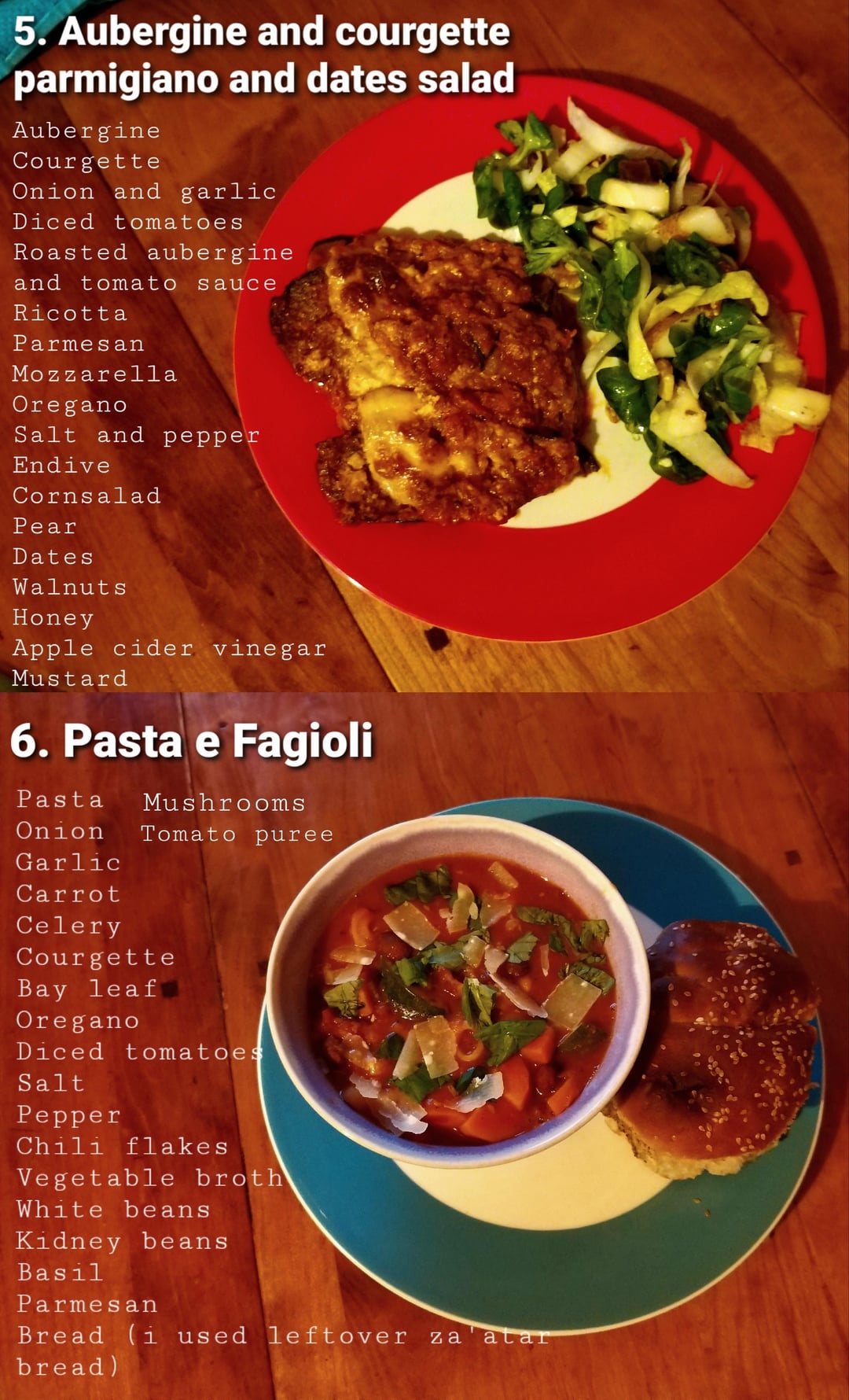 5. Aubergine and courgette parmigiano with dates salad. Slice aubergine and courgette in 1cm slices and brush them with oil. Roast in the oven at 200°c until lightly brown. Cook garlic and onion in a pan then add in diced tomatoes, oregano, water, and roasted aubergine and tomato sauce for 15 min. Spread the sauce on a baking tin, add a layer of aubergine, sauce, and courgette alternately. Spread the ricotta and parmesan on top of each sauce layer. Top with mozzarella slices at the end. Bake for 25 min. For the salad, mix apple cider vinegar, mustard, honey, olive oil, salt and pepper as dressing. Combine the chopped endive, pear and dates with cornsalad, walnuts and white cheese. Mix well with the dressing.