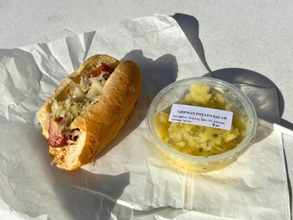 Staying ahead in quality has taken on a different meaning lately. Tariffs have effectively cut the purchasing power of a $10,000 seasonal order in half and delayed it by months, meaning the shop’s relying on classic holiday recipes and 50+ years of specialized experience more than ever. In practice, this has meant paring back its European retail presence in favor of its deli case, made-to-order meats, and Saturday grill — a beloved tradition that usually draws a line around the corner for the pop of cheddar bier brats and vinegary potato salad best eaten in the same bite.