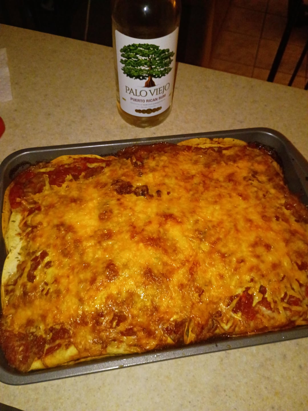 "in for a penny in for a pound" halfway through I knew I messed up but I just went with it. substituted a bottle of Goya pico de gallo and two cans of Rotel for the enchilada sauce I forgot to buy. If anything it's the least worst thing that has probably happened from rotgut Puerto Rican rum LOL.