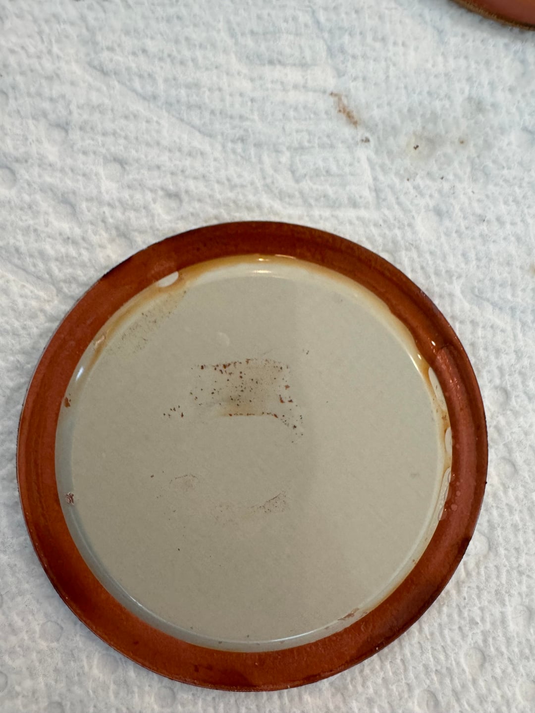 My partner and I washed the lids and temperately left them in a glass container, when we took them out, there’s tons of orange stains. Originally we thought it was just rust which we did have when first getting the mason jars years ago. But this time, it looks almost like the orange stains come from the colored rim of the lid. What is it? Is it safe to can the fruits and veggies with these lids?