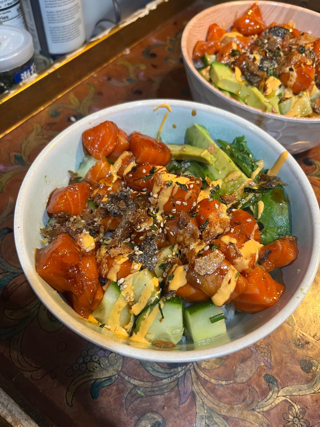 Tonight’s dinner is a spicy honey and teriyaki salmon bowl with crispy salmon skin on top