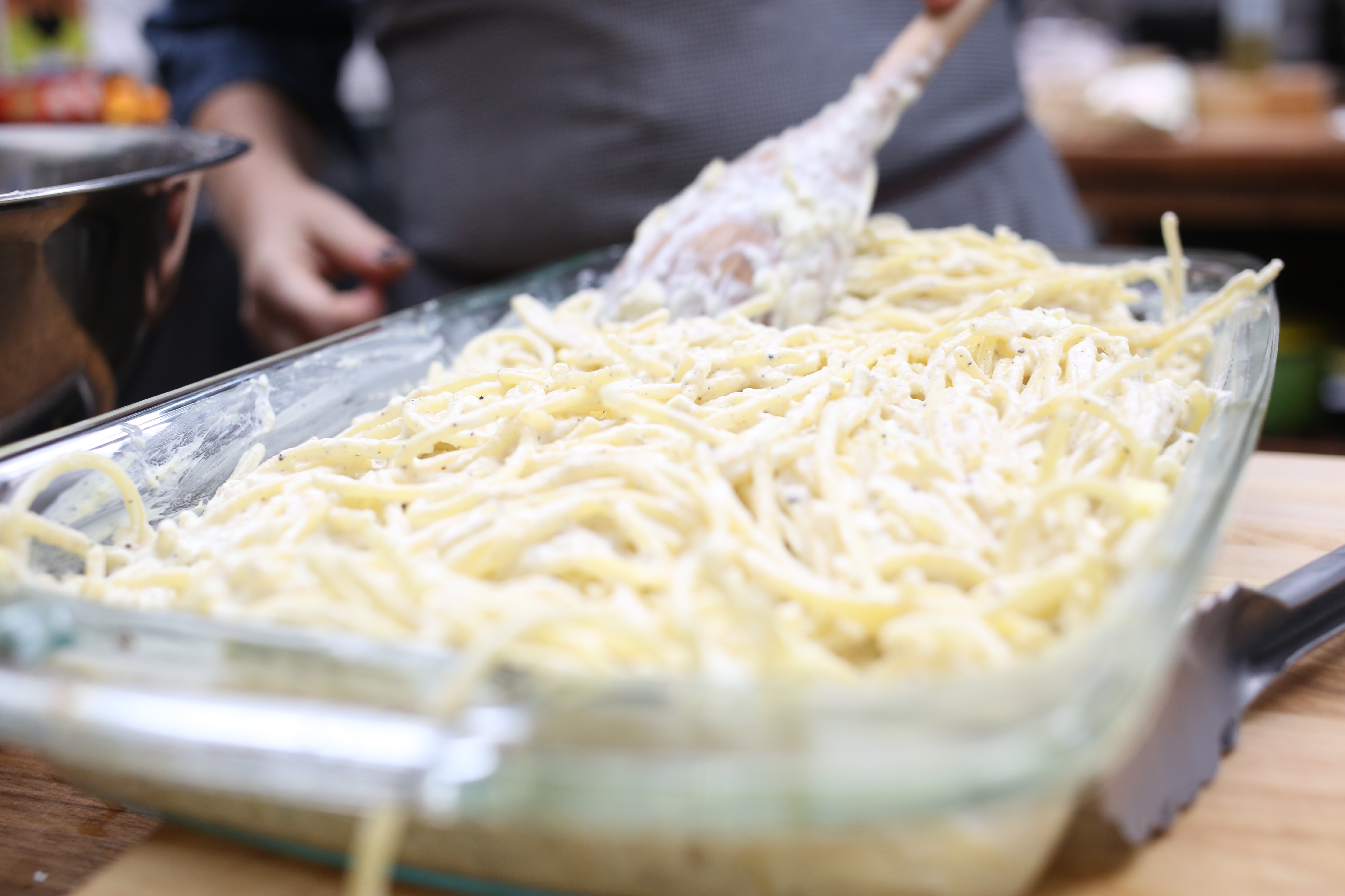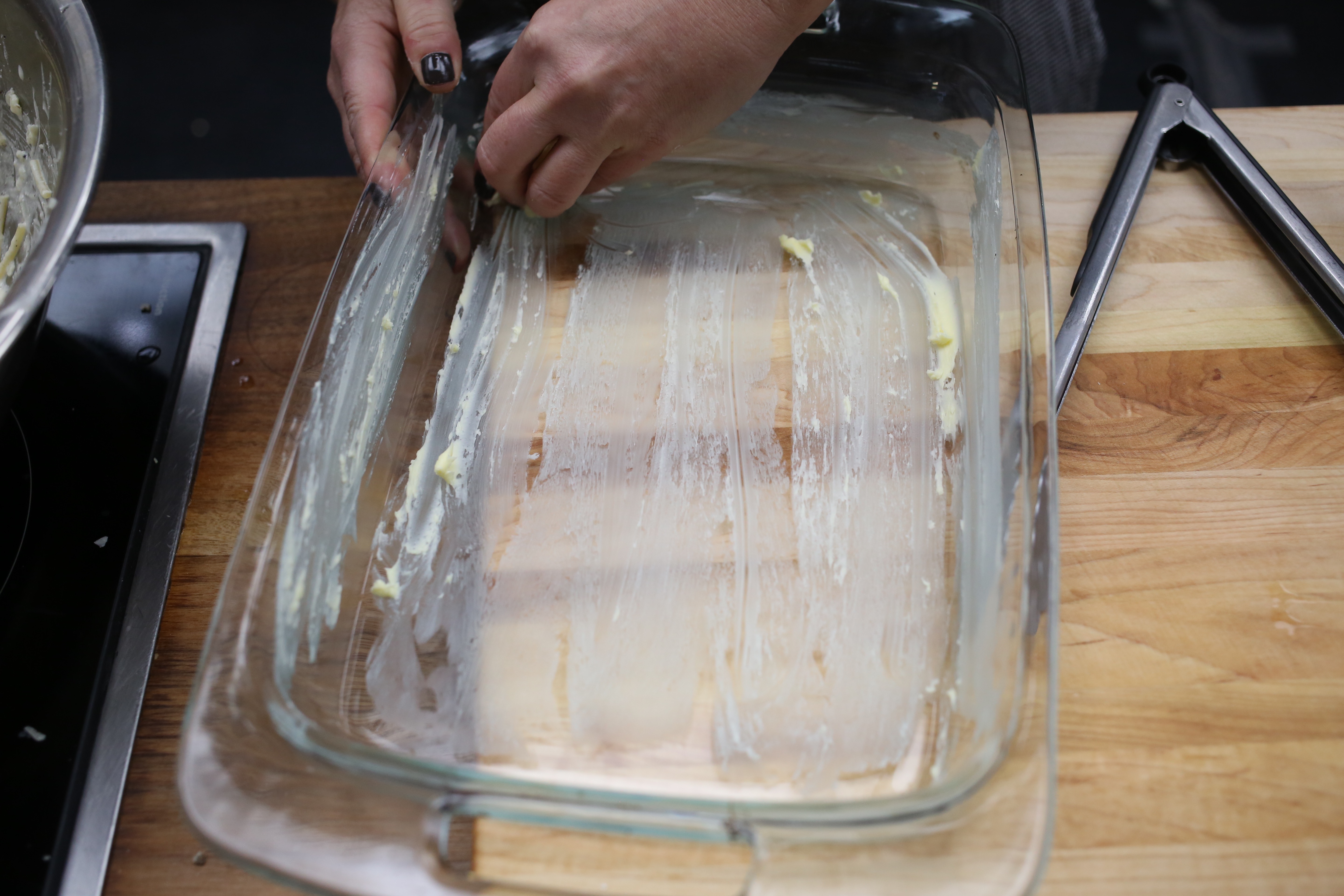 Once a baking dish is buttered thoroughly, she not-so-gracefully dumps the pasta and cheese mixture in, and spreads it evenly to the corners.
