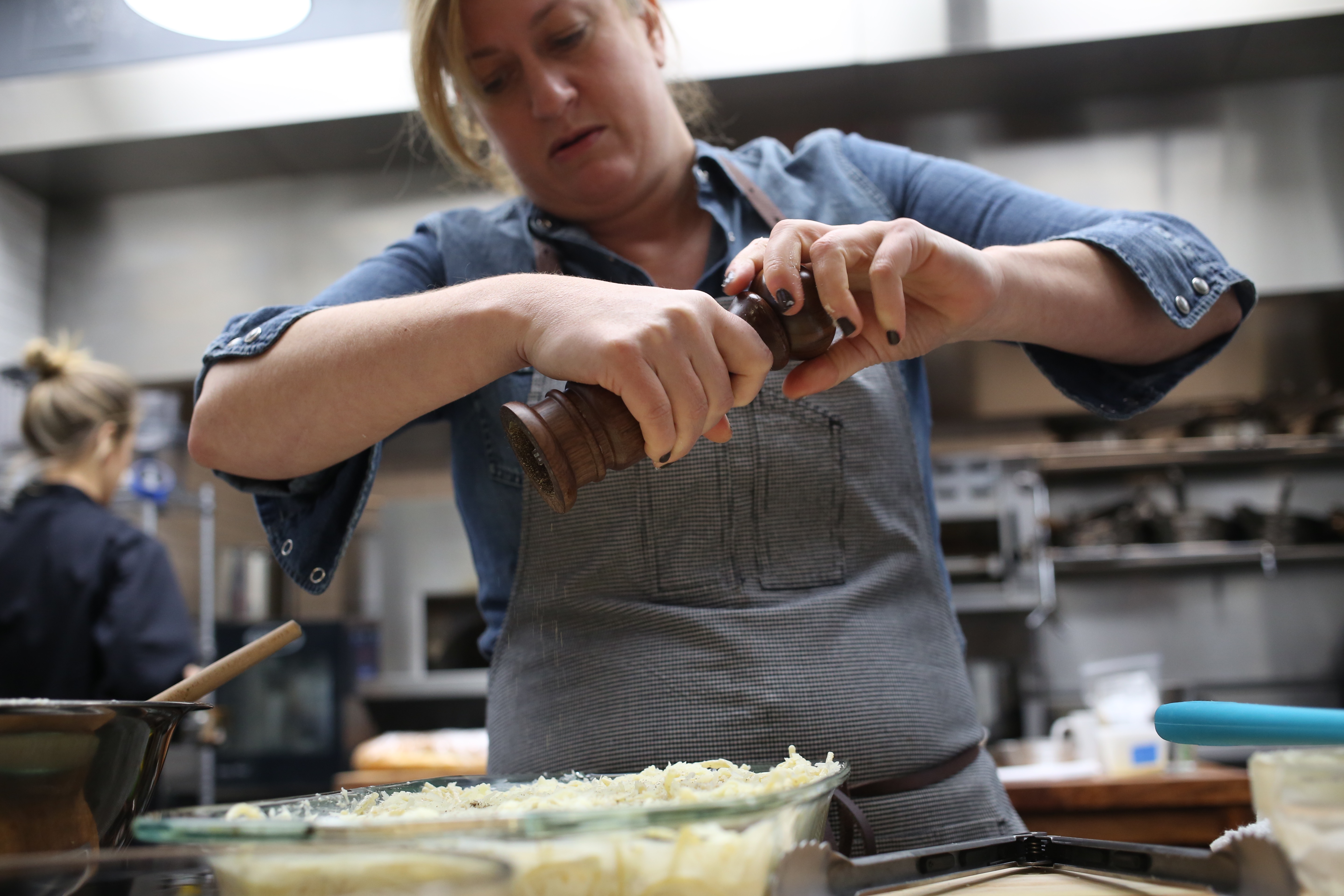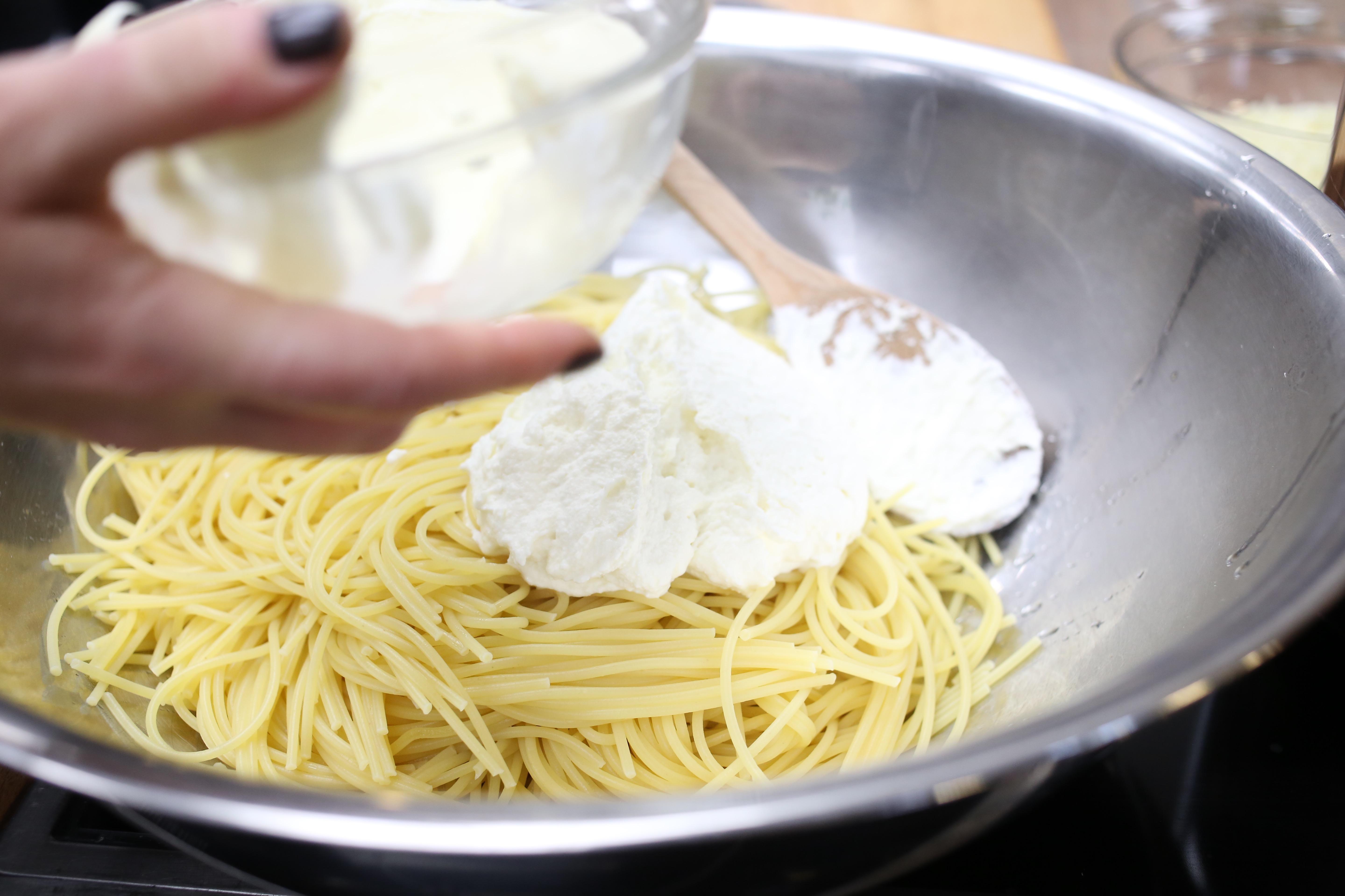 She combines an impressive amount of whipped ricotta, mascarpone, and Pecorino Romano cheeses with the drained pasta, and cracks a generous amount of black pepper into the mixture.