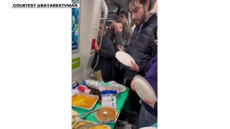 OAKLAND, Calif. – BART riders did double takes Thursday morning when a full Thanksgiving feast appeared inside a train car, complete with a table, decorations and holiday dishes.