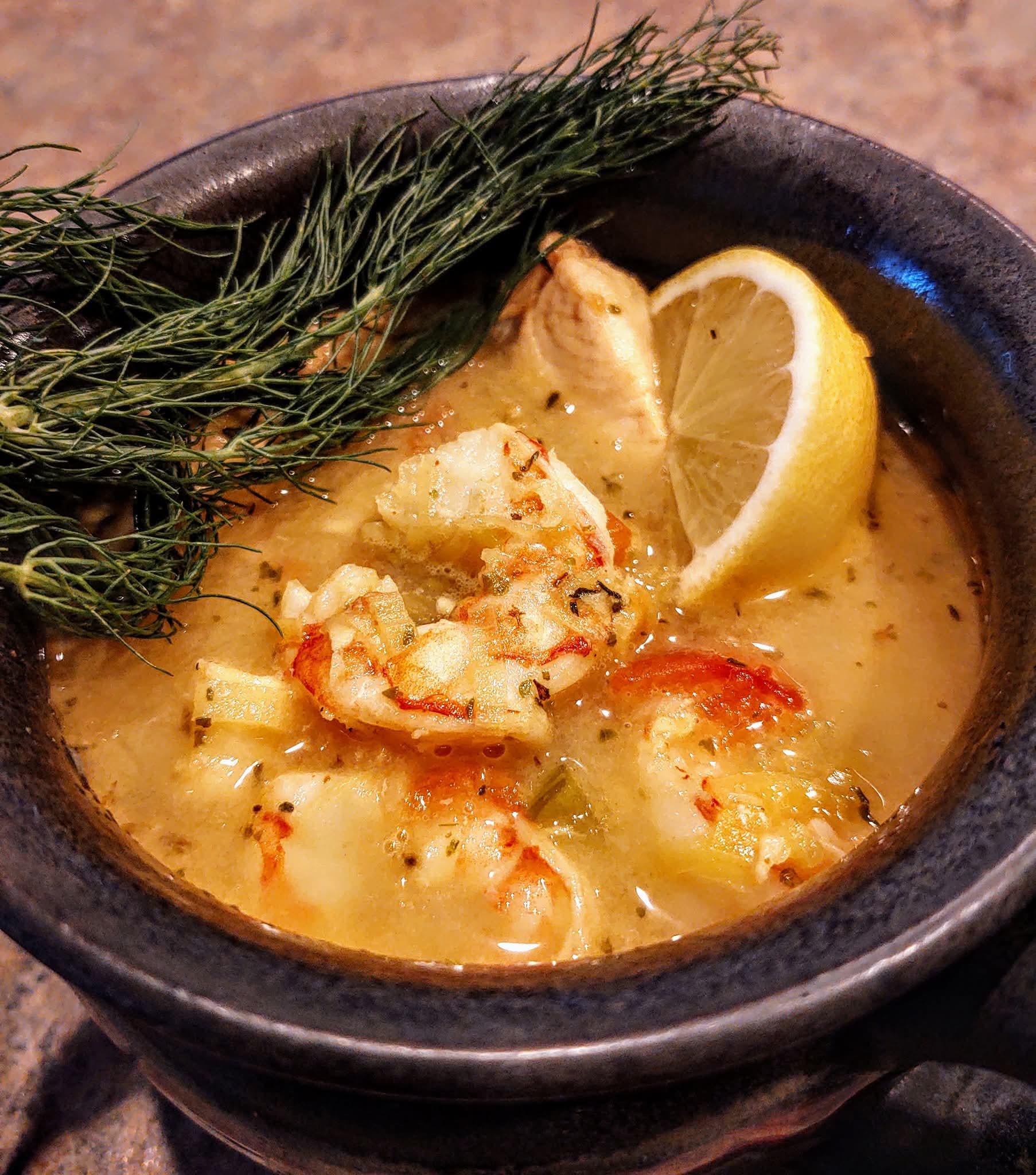 Homemade boulliabaisse on a cold rocky mountain evening.