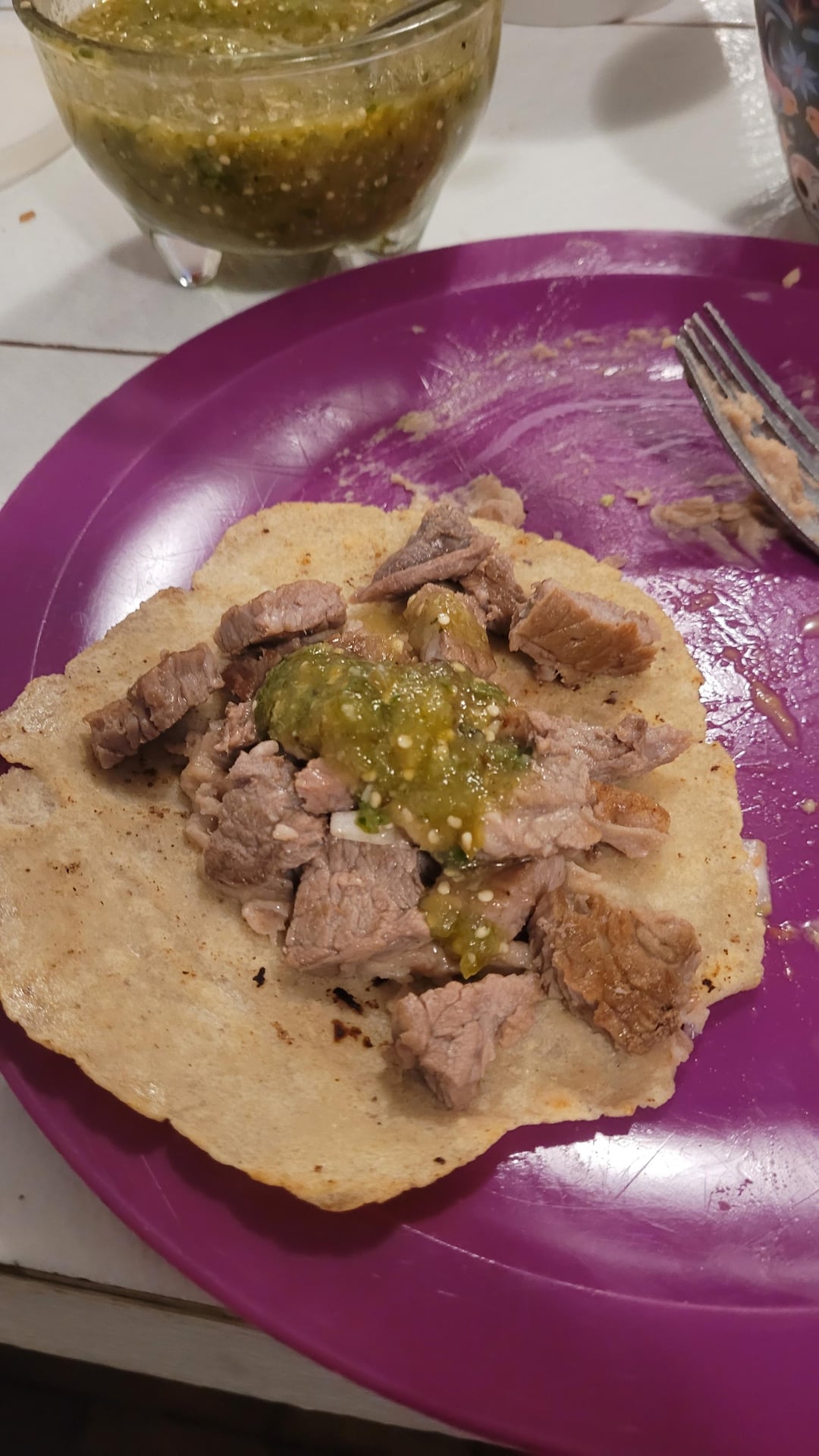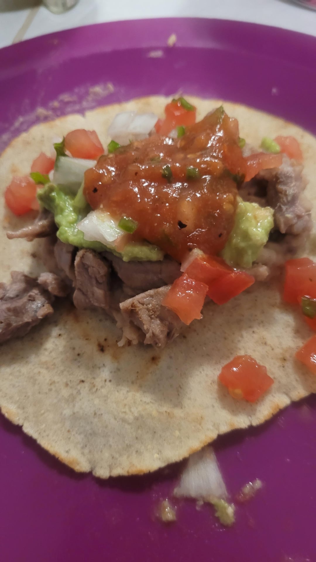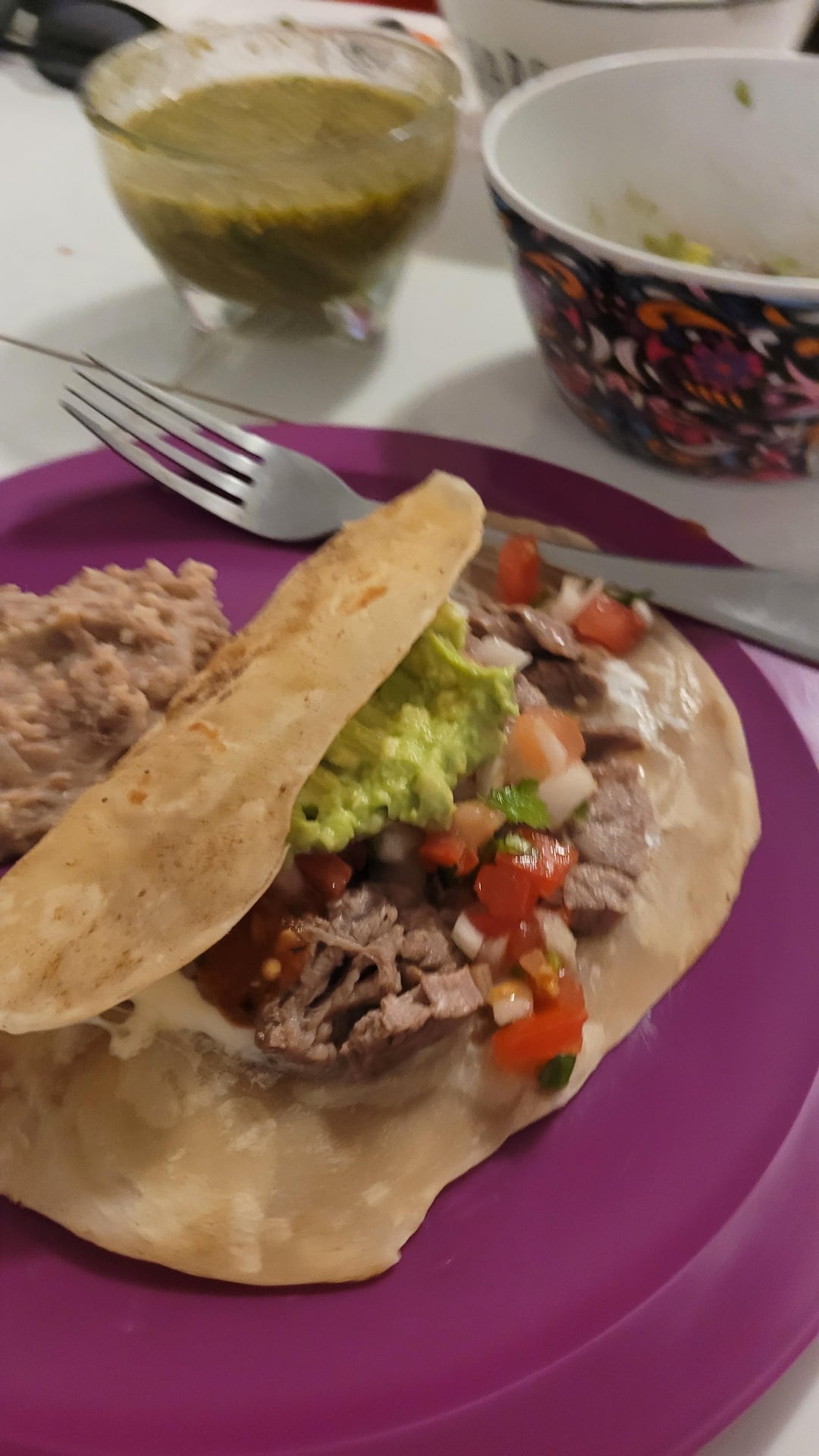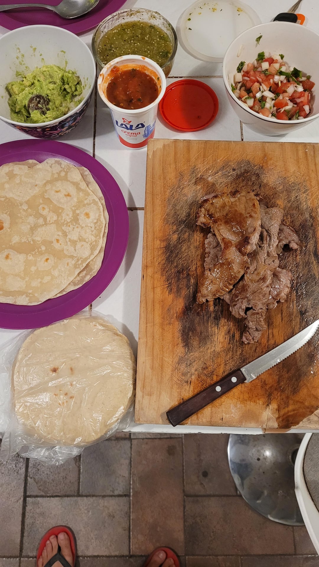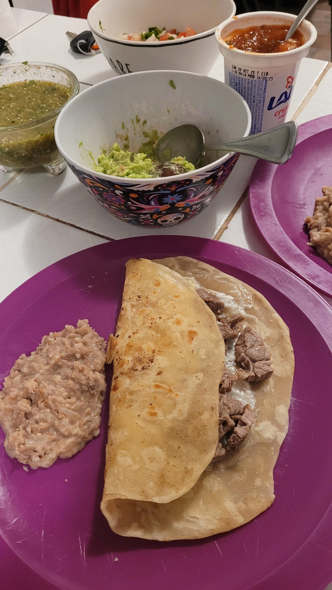 Tortillas, salsa, guacamole, refritos, from scratch. Diezmillo with salt only. Queso de Oaxaca and diezmillo bought at the grocery. Missing grilled onions, grilled jalepeño, cucumbers, and radishes but it is ok, this was enough. Tasted like a taquería!