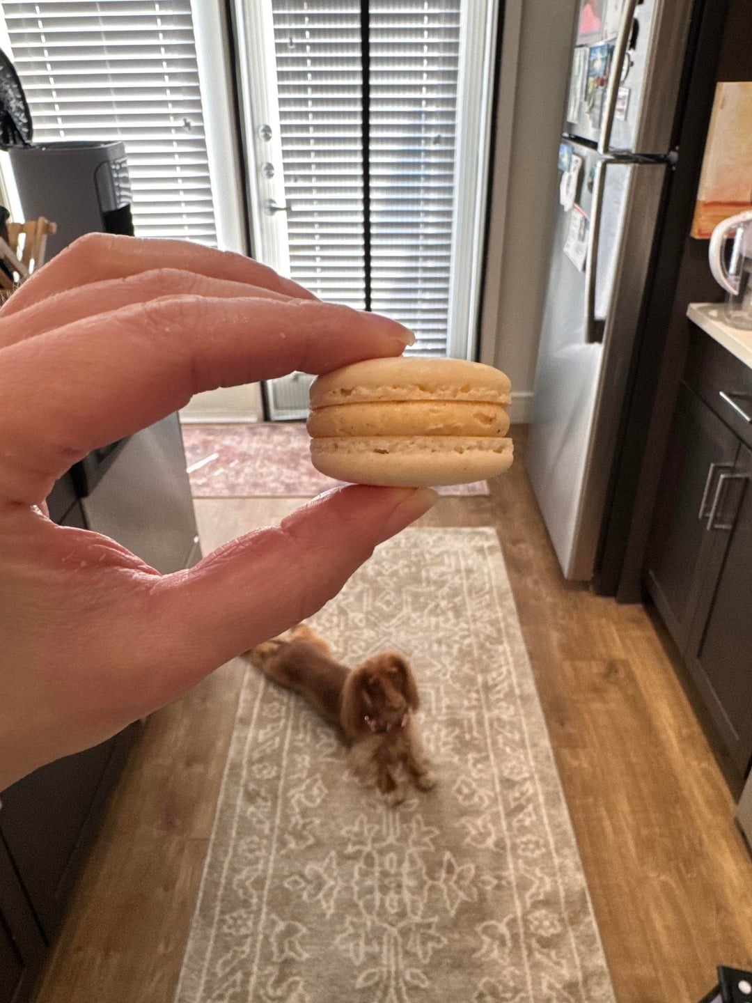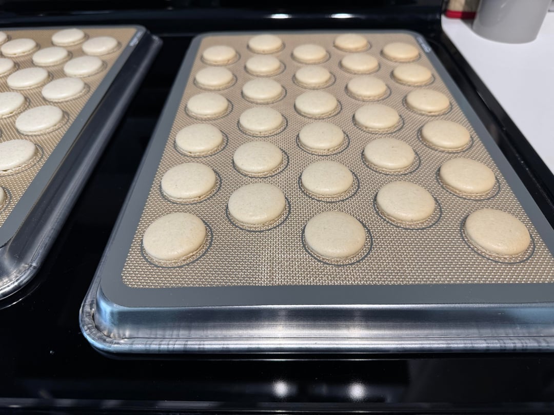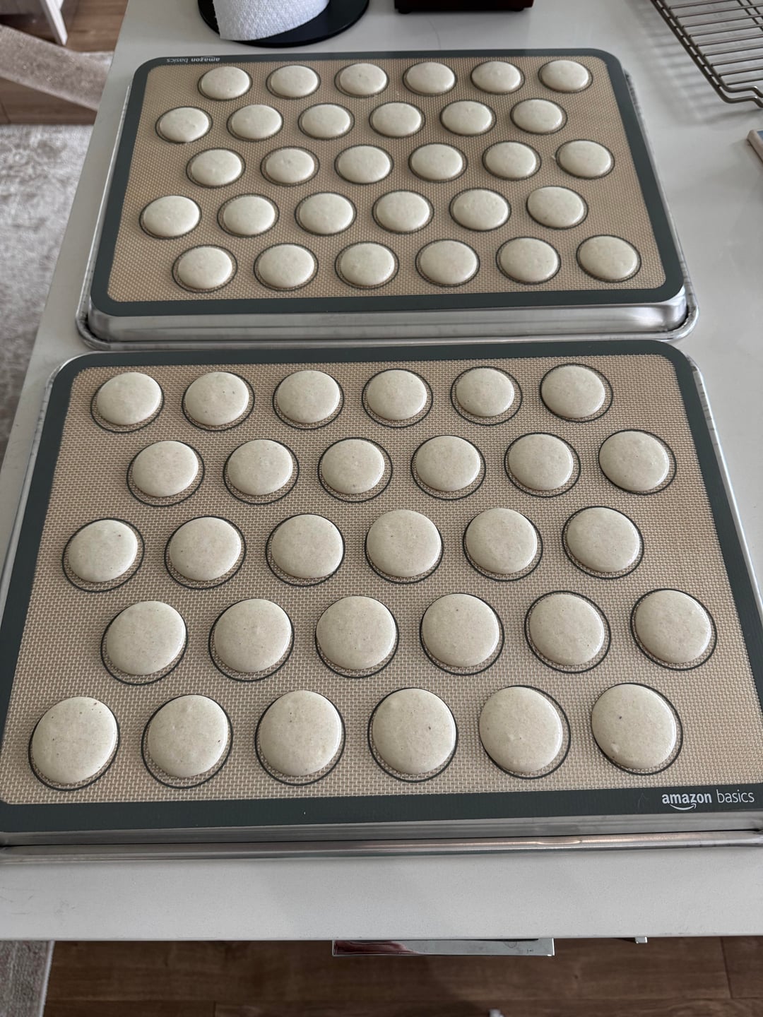 First batch could’ve used one more minute but only a few were slightly undercooked. Second batch was great! Now I know my oven temp and set up. I put a cookie sheet on the bottom rack, the shells on my new cookie sheet turned upside down on the middle rack and cooked at 315° for 14 minutes! I think the real temp was probably 320-325° but it works. Pumpkin spice buttercream in the middle is delicious 🤤