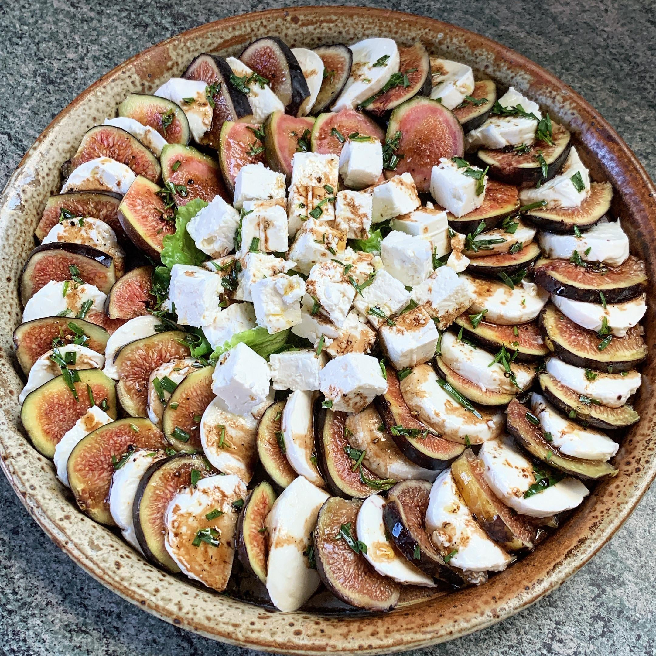 Fresh figs, mozzarella, feda, olive oil, with tarragon and balsamic dressing