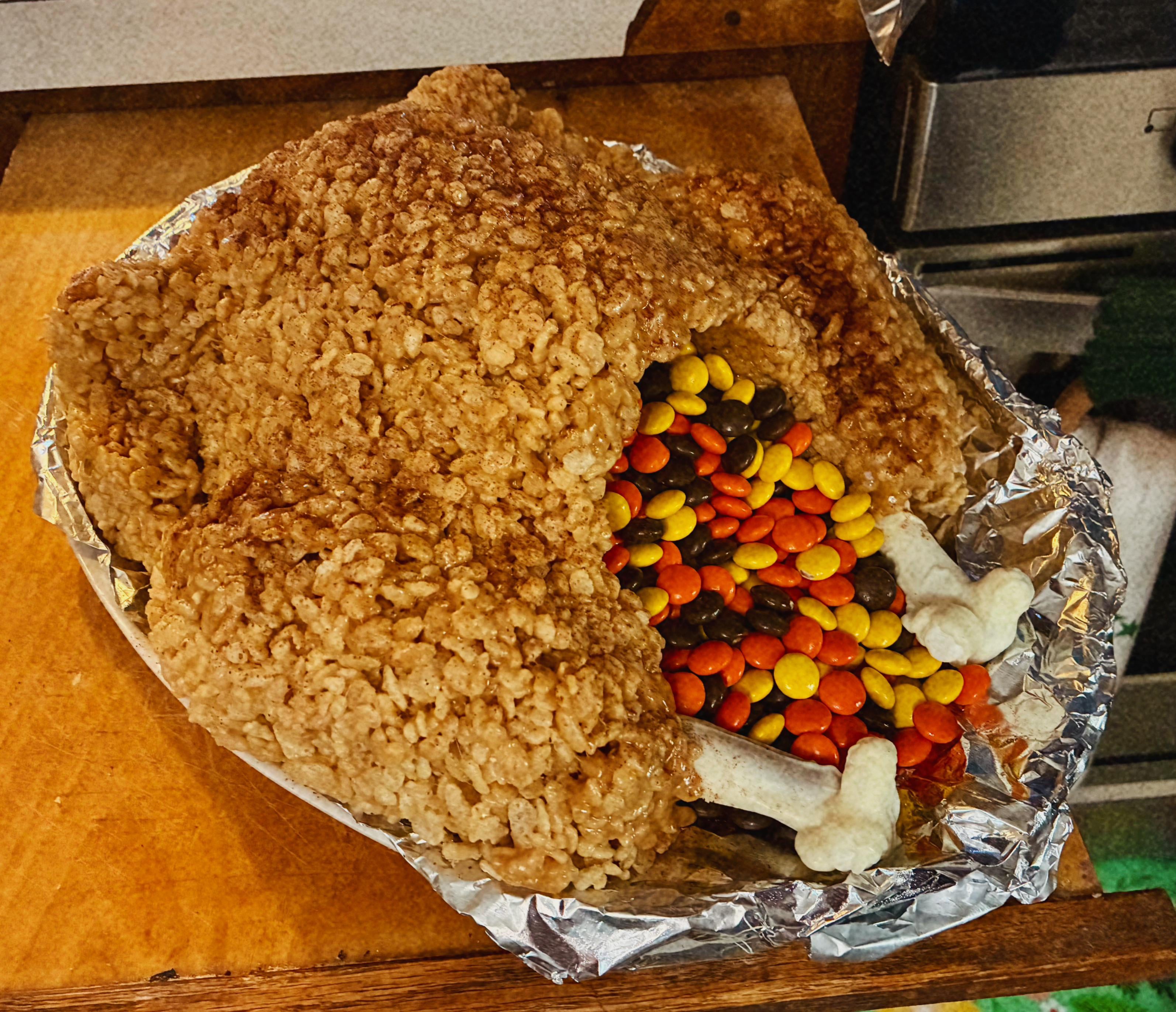 Used [this recipe](https://www.thelifejolie.com/rice-krispie-treat-turkey/#recipe) but added peanut butter and used pretzel rods dipped in white chocolate for the drumsticks.