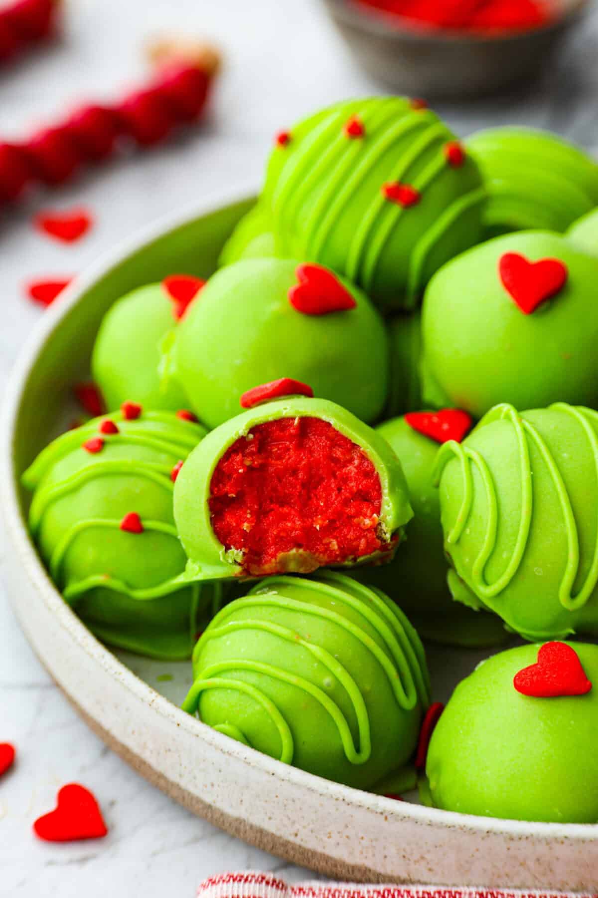 Sprinkles: Red heart sprinkles are essential for the Grinch look. The green or white sprinkles are optional.
