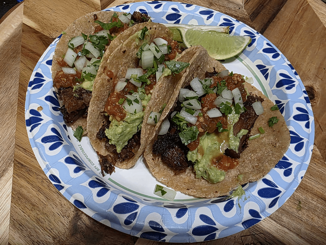 Corn tortilla [used raw ready to cook ones, medium high heat carbon steel skillet ~45 seconds each side. Stored under towel until right before serving. Charred lightly over high heat right before adding toppings.]