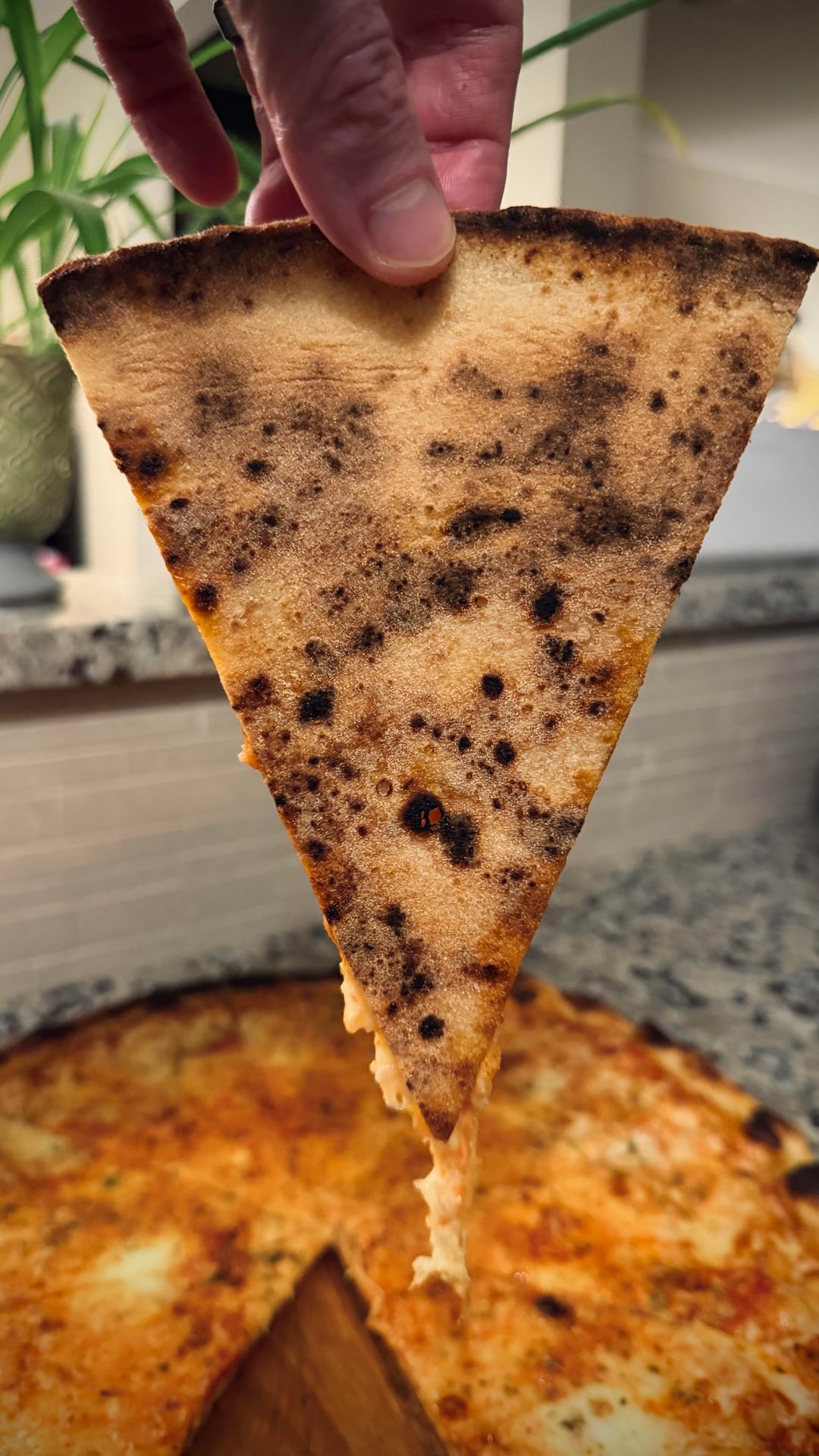 Baked hot on a preheated steel for six minutes with the broiler running maybe a bit too long. Dunno. It was still tasty.