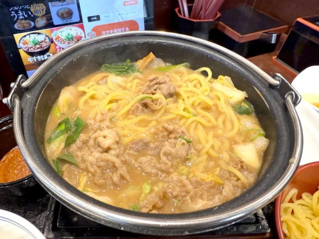 As you can see, the noodles are served in their own separate bowl. This might have you thinking that Yoshinoya wants you to eat them like the style called tsukemen, where you give dry noodles a quick dip into the broth before eating them. While you can do that, you can also opt to put the noodles into the bubbling hot pot to simmer together with the beef, veggies, and egg, keeping everything nice and warm and letting their flavors thoroughly combine, a style of ramen known as nabeyaki.