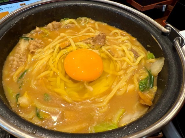 New to the Yoshinoya menu as of November 27 is the Gyunikutama Ramen Nabezen, which translates to Beef and Egg Ramen Hot Pot Meal. This is a set of strips of beef and vegetables simmered in a ramen broth that’s a mixture of tonkotsu (pork stock) and soy sauce stock, accompanied by ramen noodles, an egg to crack and cook in the broth, rice, and pickles. There’s also a non-set version of the ramen that skips the rice and pickles and, at 899 yen (US$6), is a little cheaper than the 987-yen set meal.