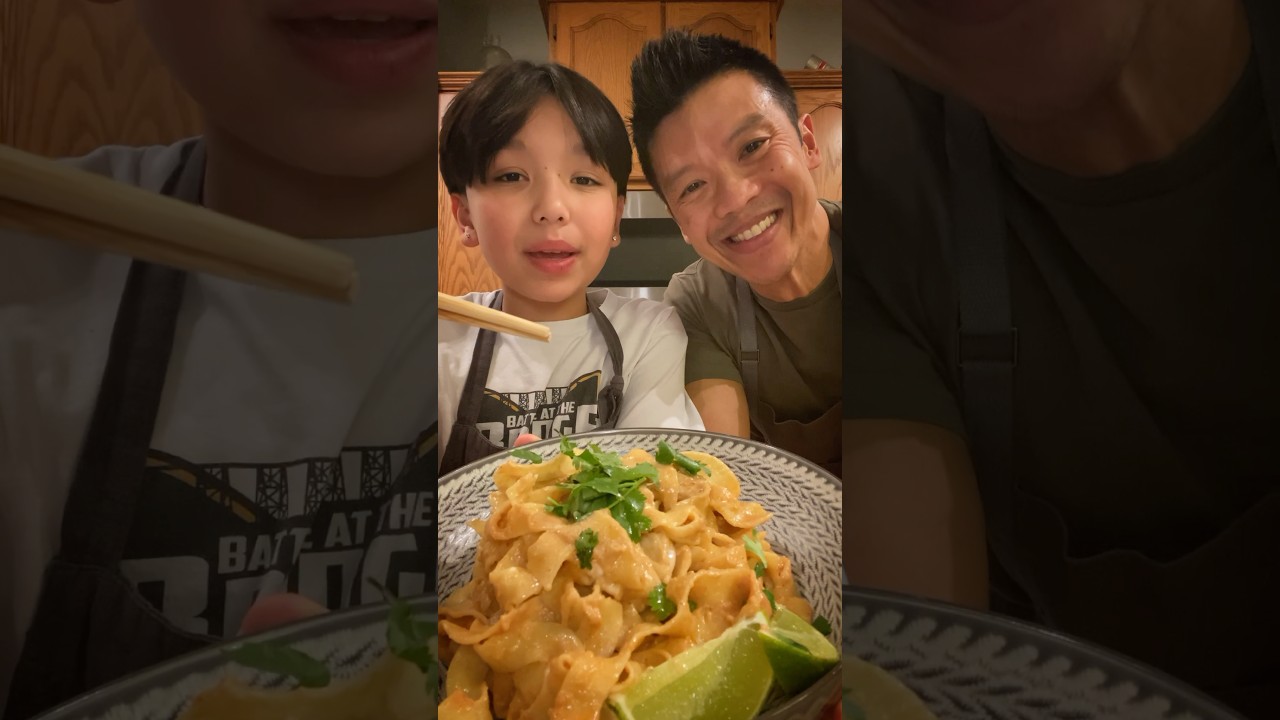 super rich and creamy today we’re making these Thai peanut chicken noodles let’s get right into it start off by making our sauce which includes coconut milk peanut butter Sriracha minced garlic and ginger some brown sugar soy sauce sesame oil and lastly some lime juice oil in our Pan Once our oil is hot we’re going to add in our garlic and our Ginger nice chicken breast salt and some pipa C our chicken all the way through remove it from the heat we’re going to add in our sauce let our sauce simmer until it thickens up it should take about five minutes while we’re waiting for our sauce we’re going to cook our noodles cook these till they’re nice and on Dente we just used egg noodles but you can use fetuccini noodles or whatever noodles you want add our noodles into our sauce add back in our chicken some fresh cilantro and a couple lime wedges oh yeah Cheers Cheers m