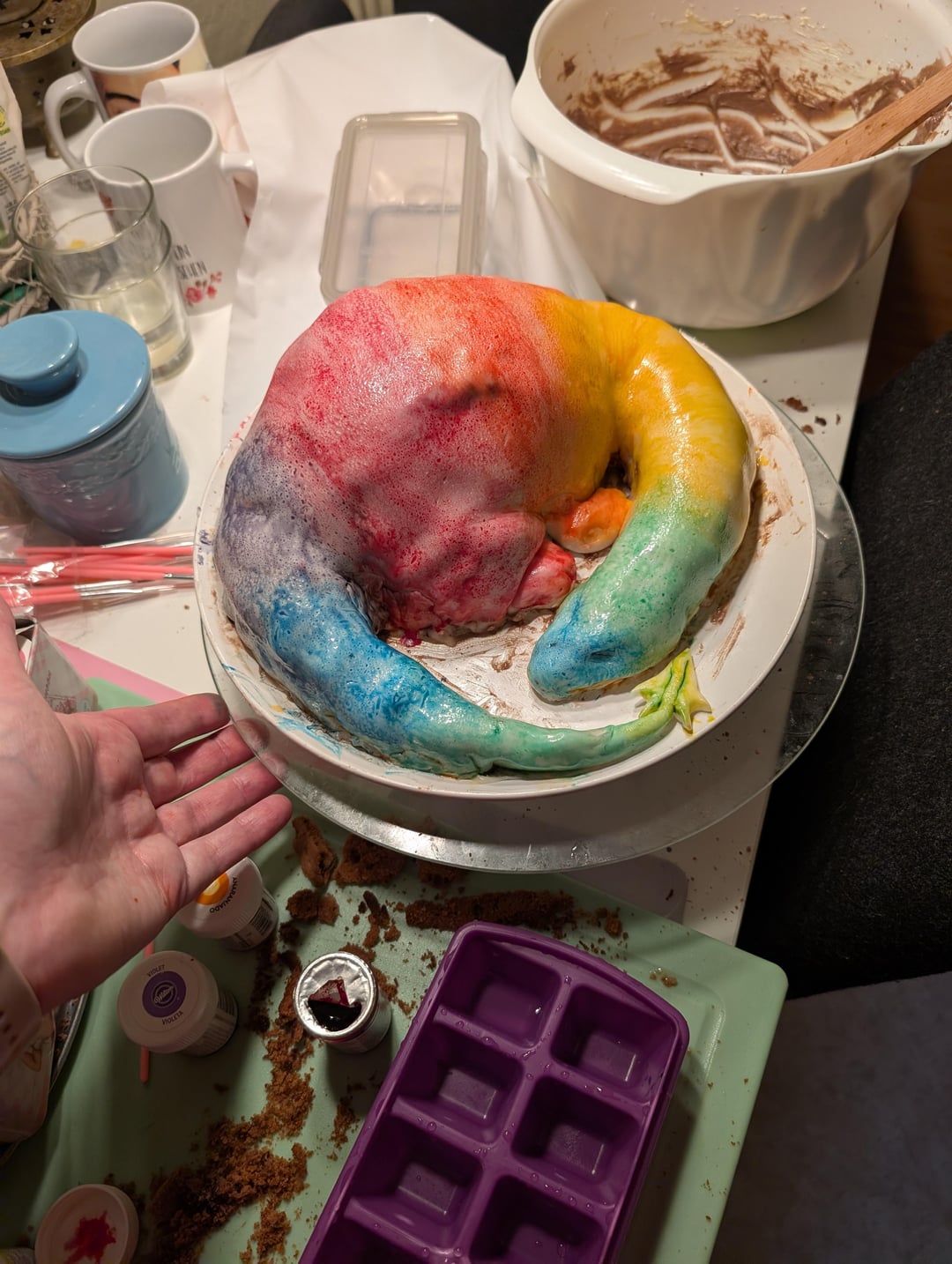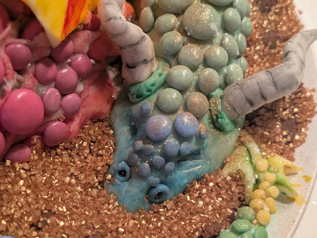 Unfortunately the Fondant Skin tore apart. Probably got too moist from the frosting. Fortunately the smarties cover it up quite nicely 😅