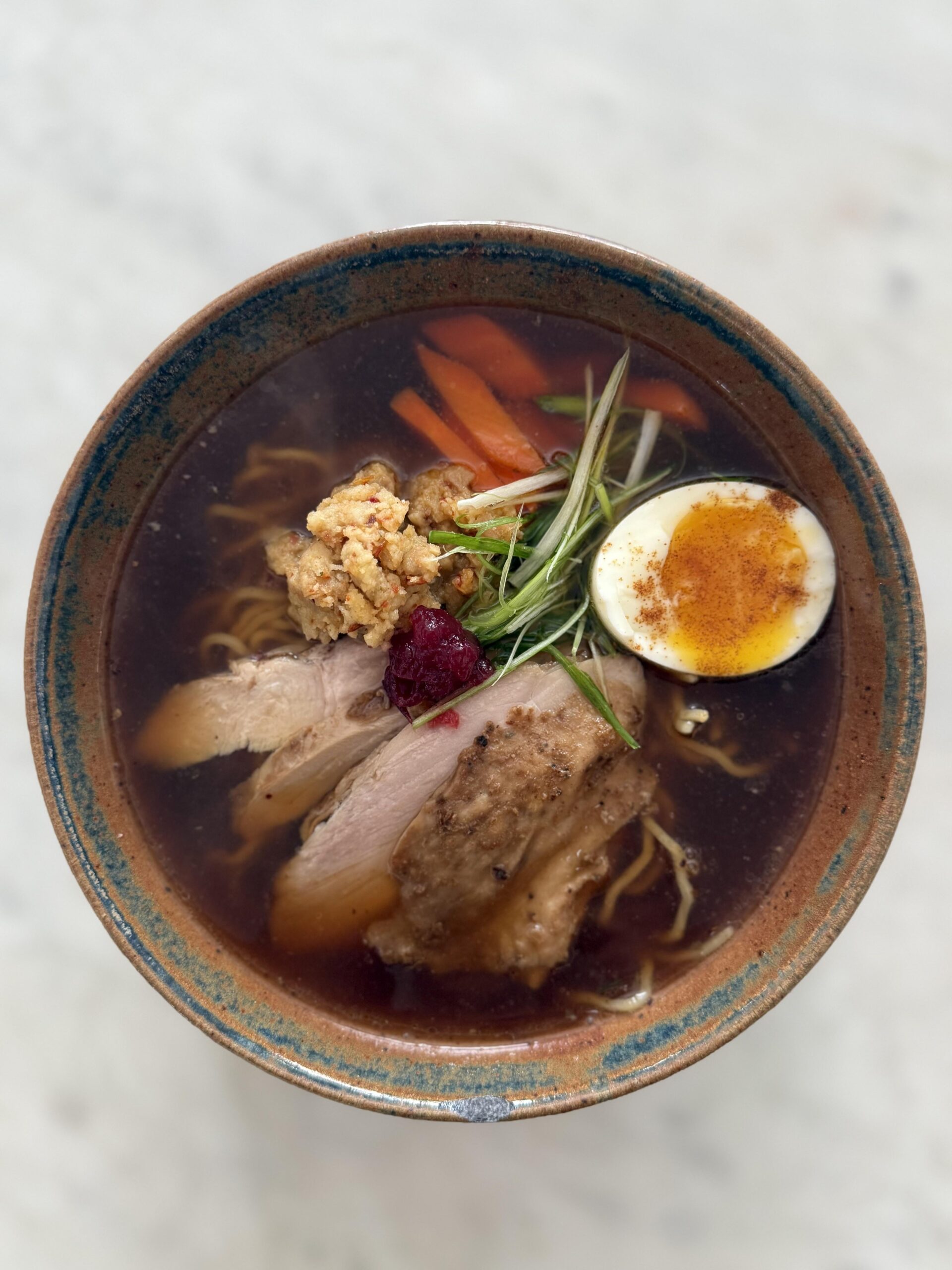 This year’s turkey ramen, made from Thanksgiving leftovers, a.k.a. the “Black Friday Special.” The Cajun-brined and spiced turkey was done sous vide, so I had to cut up the bird before cooking it anyway. Threw the spine and the carcass into an Instapot for broth. Reduced some shoyu and leftover gravy into a tare. Sliced some leftover turkey leg for “chashu.” Mixed the stuffing with some chili crisp for a spicy stuffing ball. Cranberry juice and soy marinated egg, glazed carrot “menma,” a dusting of cayenne pepper and a dollop of cranberry finished it off. Overall, I tried to stay faithful to the flavors of the previous night’s dinner as much as possible, but with some augmented depth and saturation necessary for ramen. Thanksgiving dinner in ramen form!