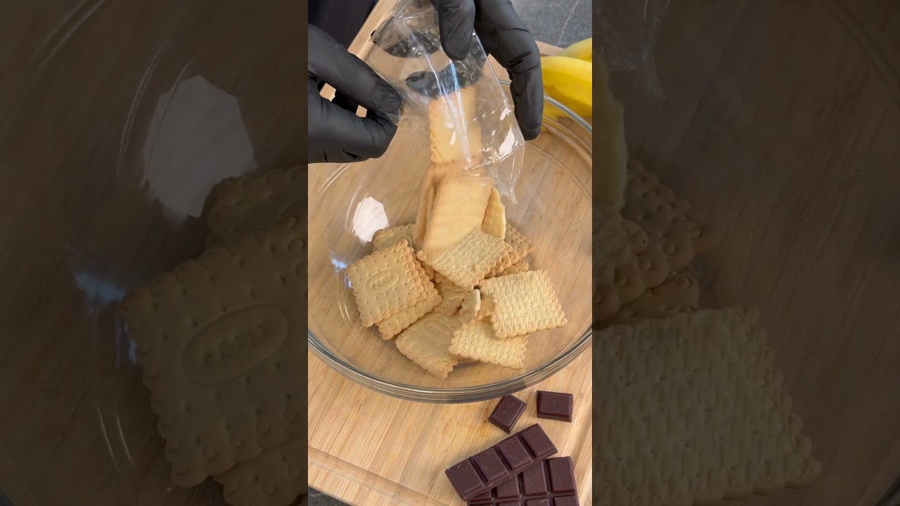 Trita grossolanamente i biscotti, riduci la banana in purea, ed unisci tutti gli ingredienti finché non otterrai un composto compatto ed omogeneo.