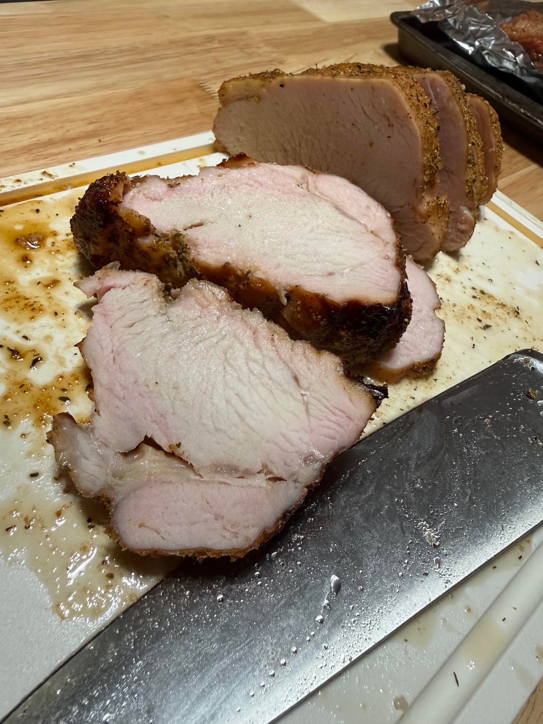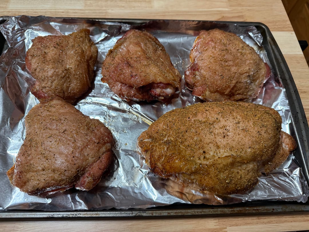 As you can see, the breast doesn’t have much of a smoke ring and while I liked the results for both it and the thighs, I think if I were to run this again, I’d go 225 for 2hrs and then finish at 325 for color and crisp of skin.