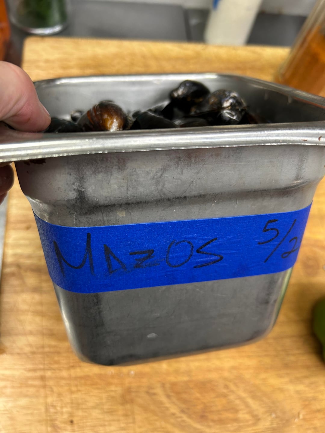 Ahhh the pan of mazos ready for their white wine sauce and linguine bed.