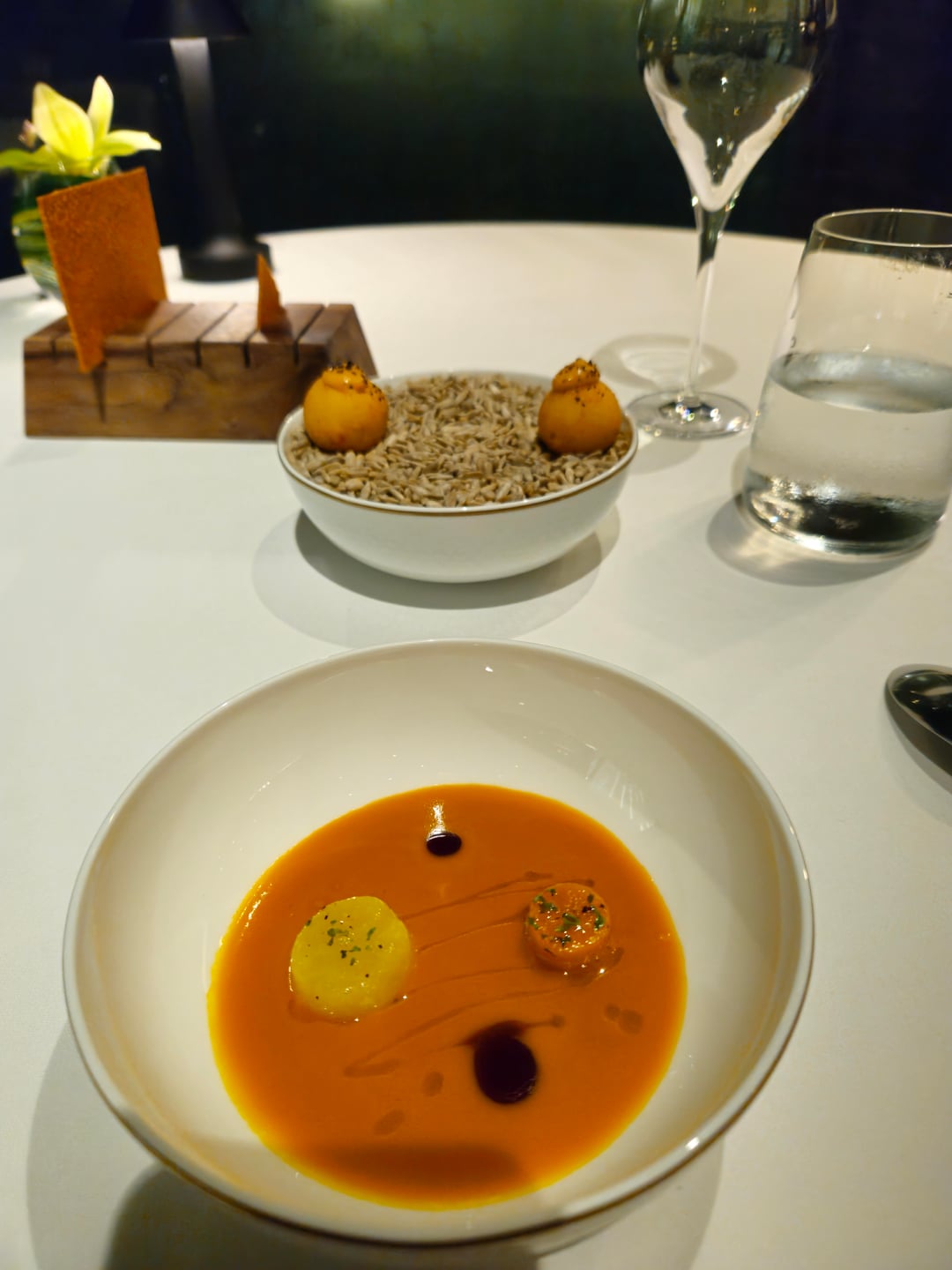 The first real Amuse-bouche was small tomato/vegetable soup and two bites of profiteroles (can't remember that precisely, because they were not in the printed menu). Absolutely delicious 9,5/10
