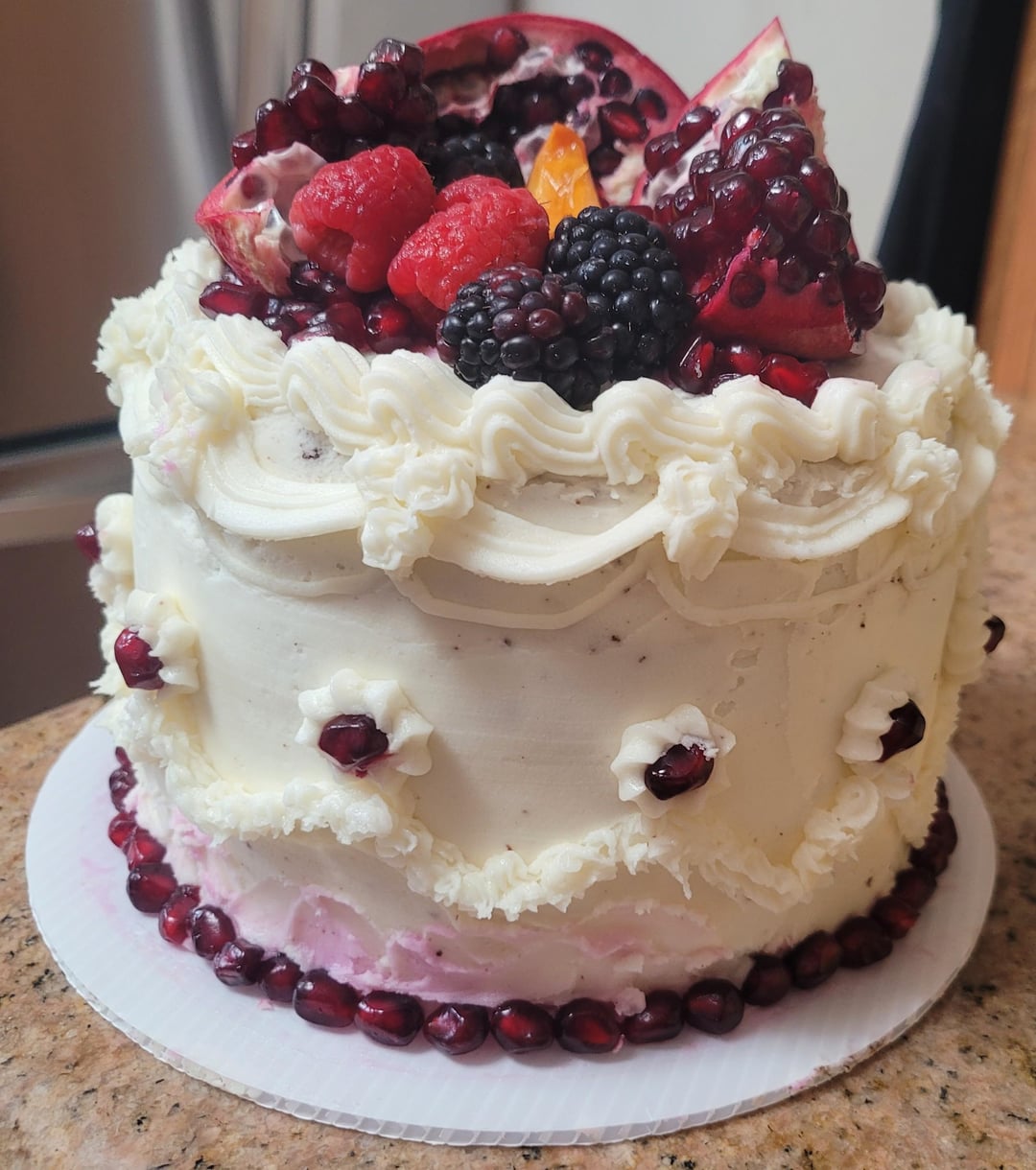 (Dark chocolate cake with a pomegranate compote (more so a jam) and vanilla (with orange extract) buttercream, garnished with pomegranate arills, blackberries, raspberries, persimmon,) by Icy-Reception1947 1 Comment Glittering_Bad_8011 3 weeks ago Oh wow! I would love to try this!! Yum