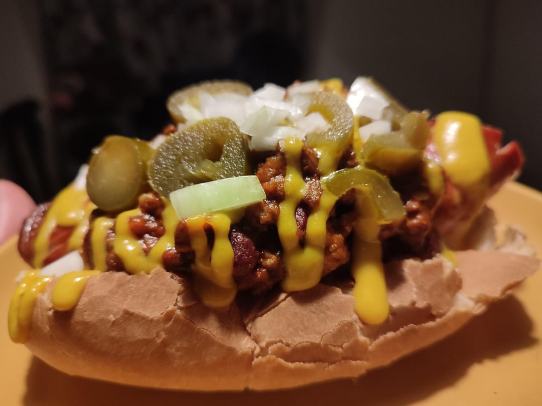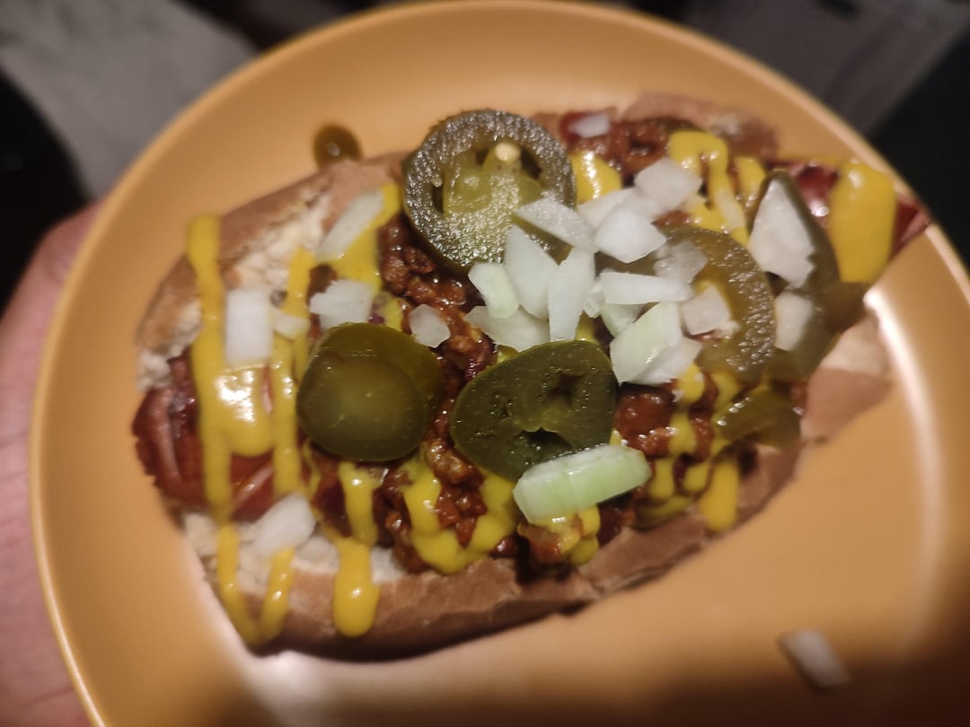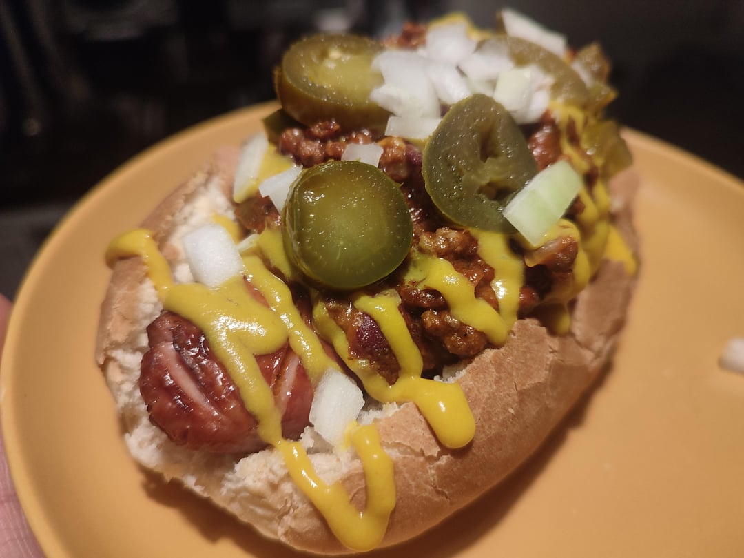 Matteson’s smoked sausage chilli dog using leftover chilli