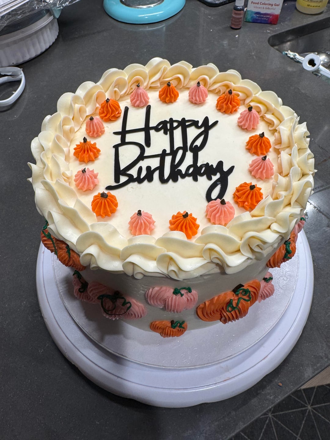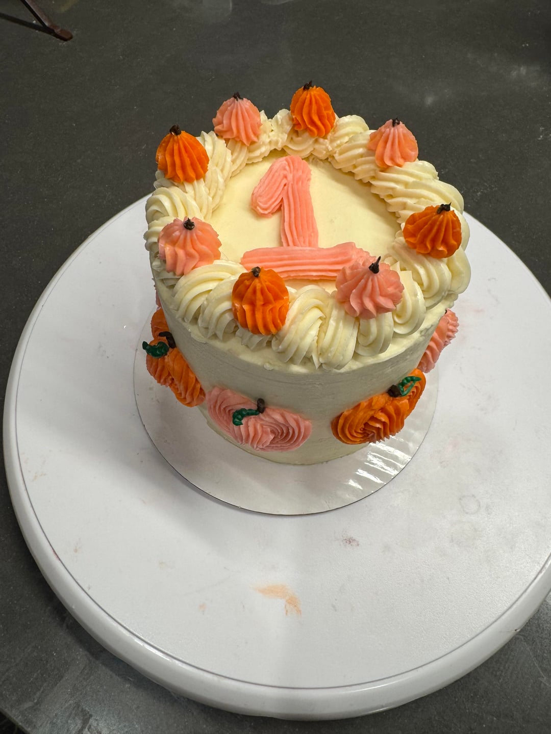 Made this cake and smash cake for a cute little girl that I met at library story time. Mom wanted pink and orange pumpkins, and after consulting Pinterest this is what I came up with that I could reasonably accomplish.
