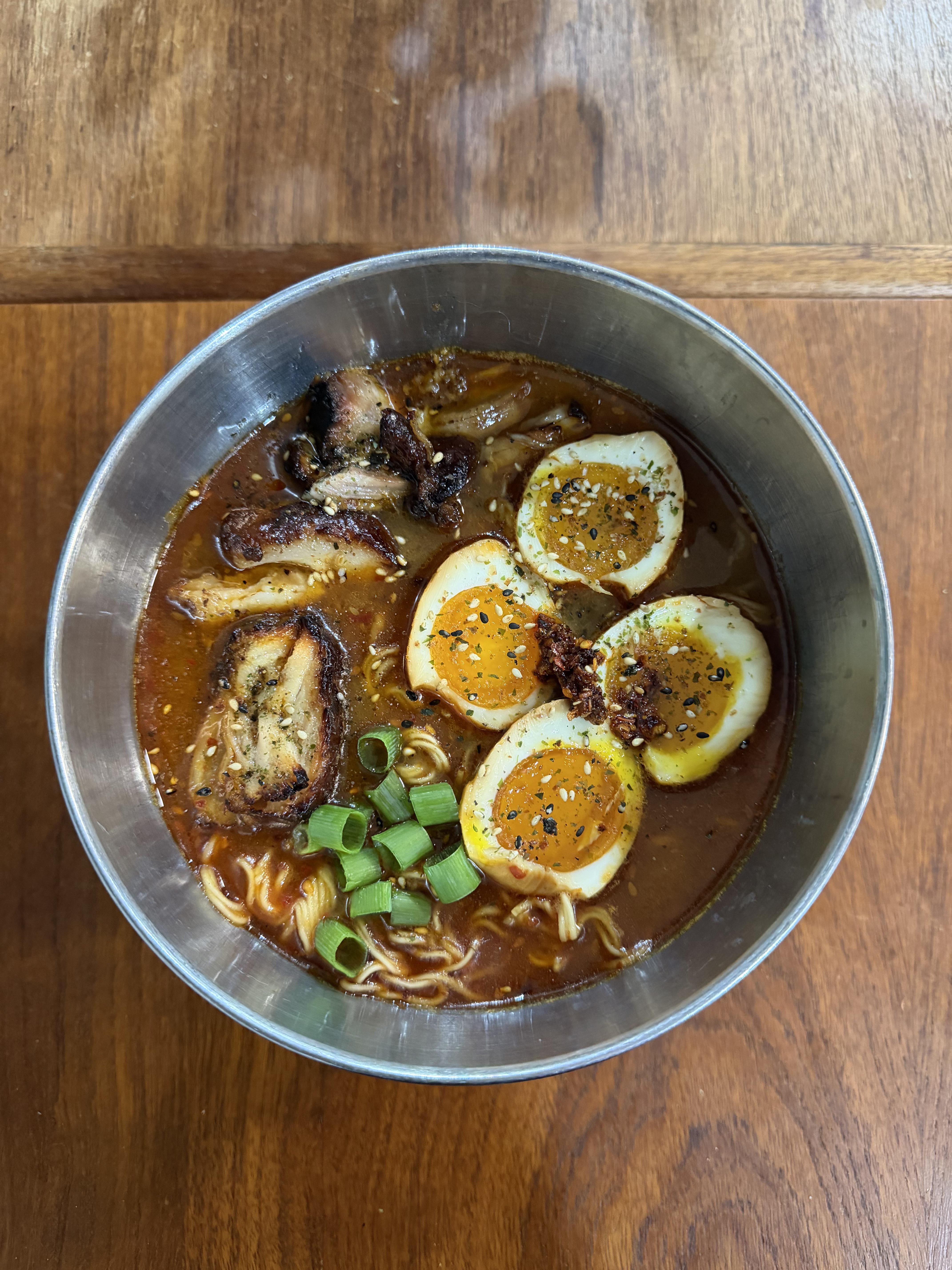 12 hour chicken bone broth, pork belly, two marinated eggs, and green onion
