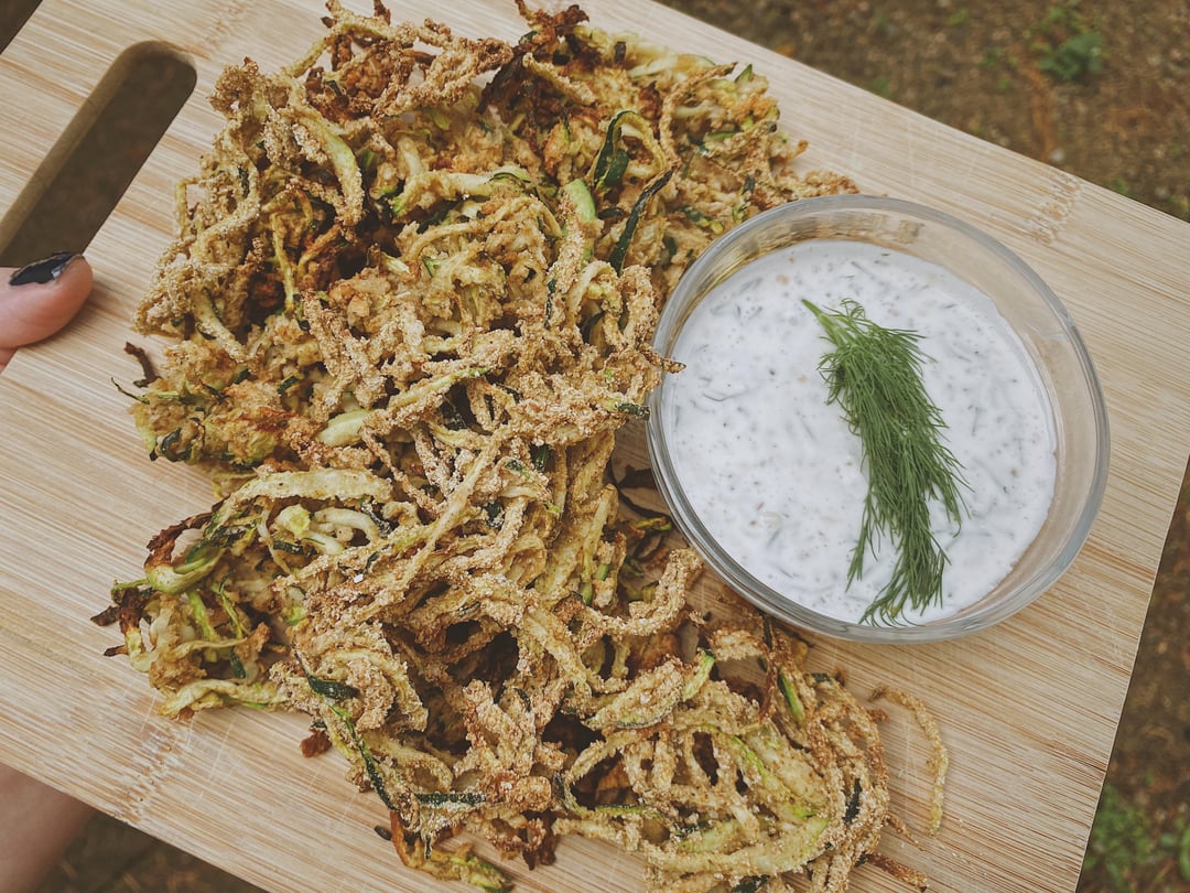 crispy air fryer zucchini spirals w/ garlic dill yogurt dip