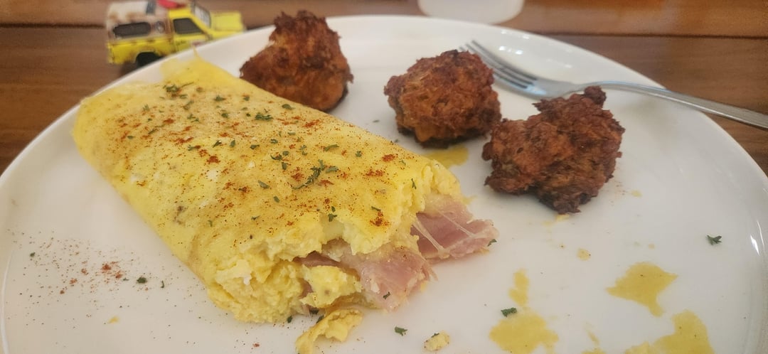I just wanted to share some pics of the omelette I made today. I've never been very good at making them, but I've been practicing a lot lately and I think the one I made this morning was my personal best. There's not much to it, just ham and cheese with some herbs and spices. Alongside it are some sausage balls my wife made and one of my son's toy cars (it's Todd from Cars).