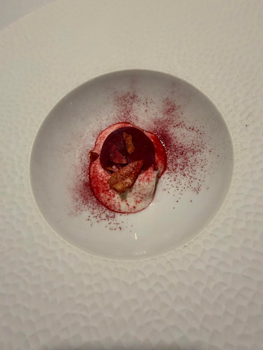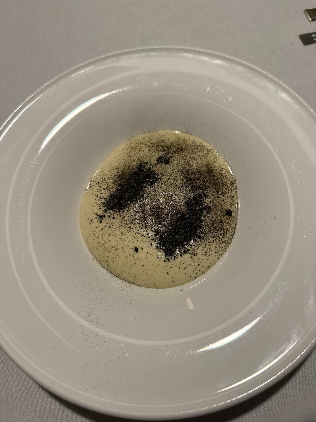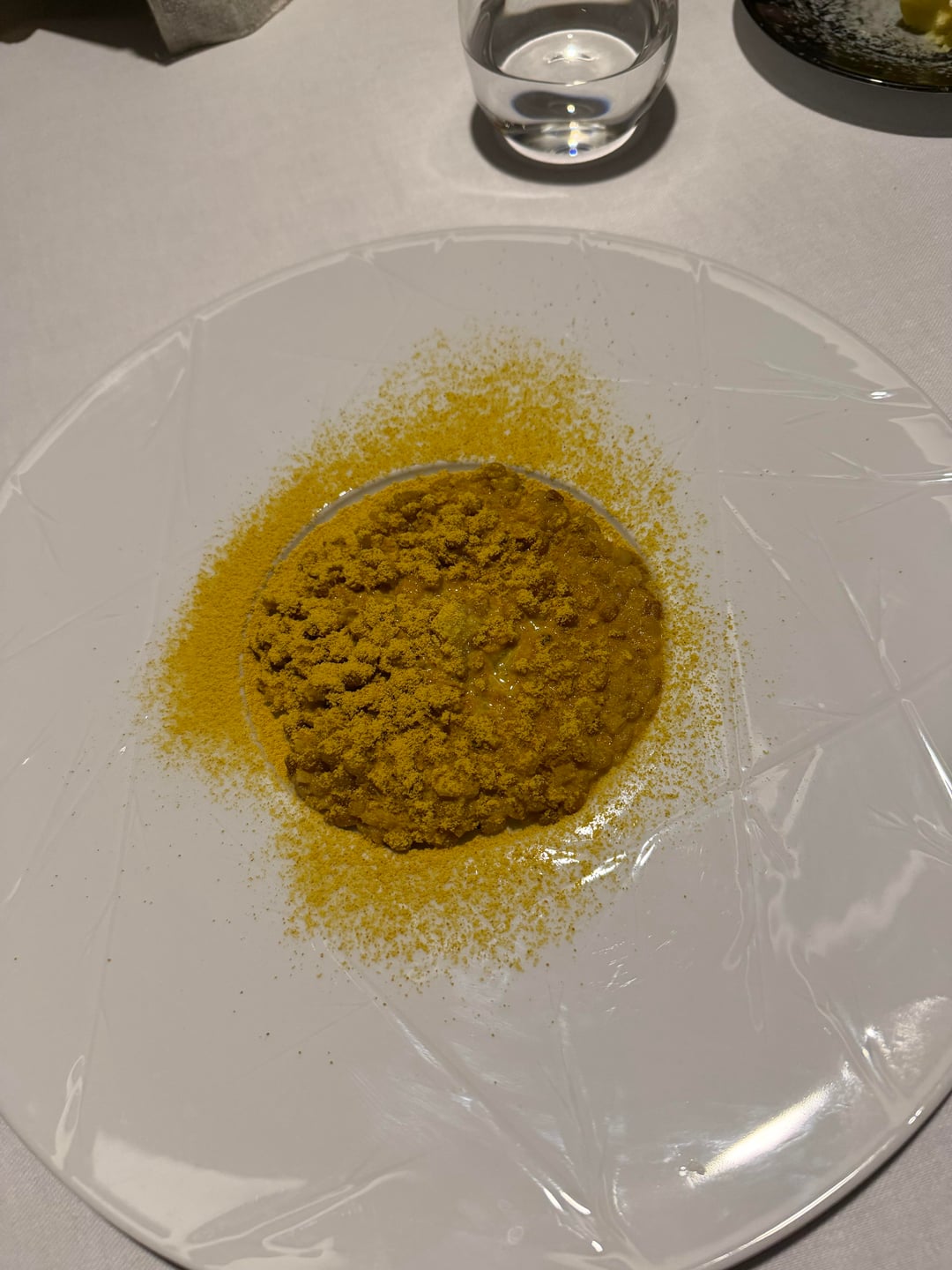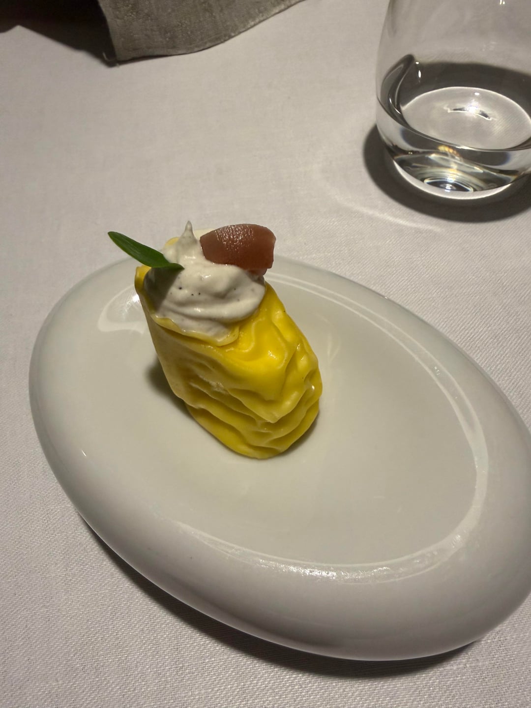Not pictured are welcome bites. First a lone Parmigiano Reggiano bombolone. Then a trio of bites: ricotta cannolo (more nuance here but cannot recall), mortadella pastry(?) it was almost like a panipuri, and a cuttlefish ‘slider’ on an ink bun. Great first bites. A solid preamble to what was waiting for us in the menu.