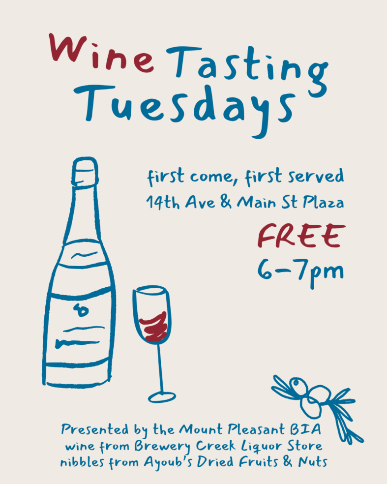The last time I followed a sign that said “Free Wine” I woke in bathtub in Havana with a pounding headache and one less kidney than I previously sported, but enough about Bar Mitzvahs. Luckily our friend and contributor Kurtis Kolt is as trustworthy as they come and he’s the ringmaster in charge of choosing three interesting wines and then leading the gathered through the informal tastings every Tuesday Night from 6-7. The tastings come with fun themes like bubbles (our friends from Bella‘s bubs were there) and there’s even light snacks from neighbourhood stalwarts Ayoubs. And to be clear — it’s free. All you have to do is show up at 14th and Main (preferably early as they’re limited to 35 people). They’re running for the rest of August and likely September.