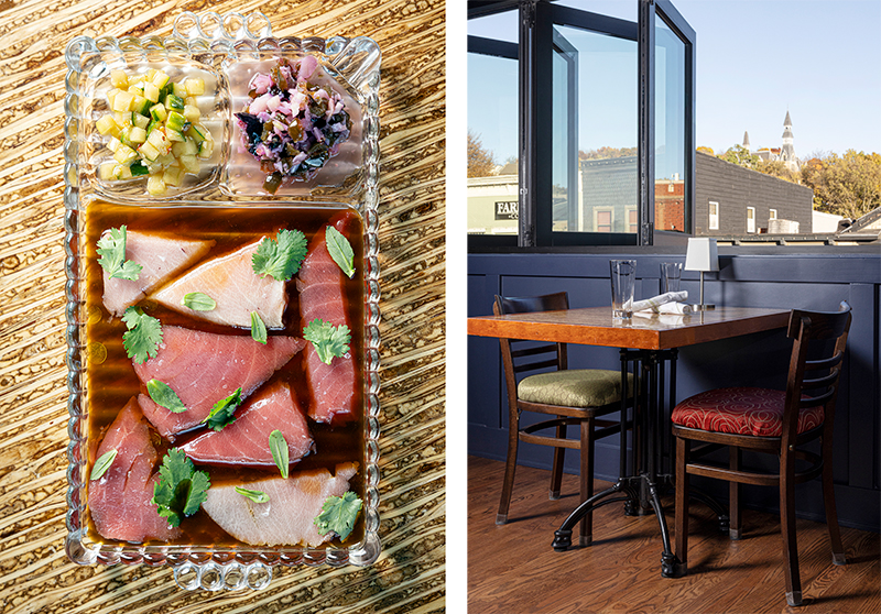 Left: The bluefin tuna crudo. Right: Diners enjoy a view of downtown Parkville.
