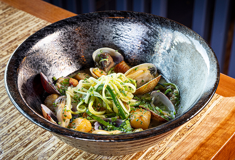A bowl of clams are bathed in a broth of wild mushrooms, gnocchi, and a tangle of zucchini.