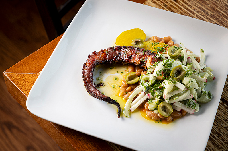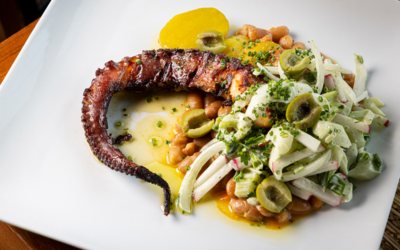 Poached potatoes and Italian gigante beans accompany the grilled octopus.