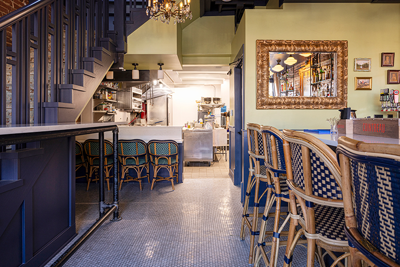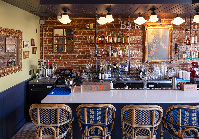 Classic French rattan seating pulls up to the cozy bar.