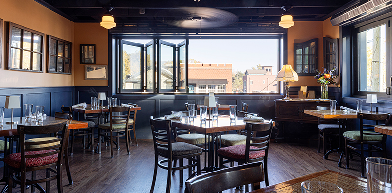 With the tile floors, vintage mirrors, and cheery blue and yellow walls, The Parker Hollow has the feel of a small cafe in rural France. All photos by Aaron Leimkuehler