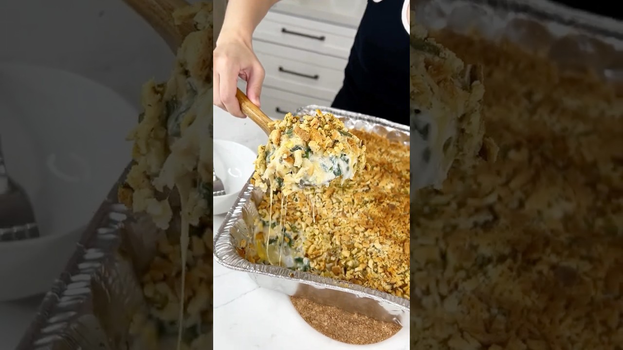 This is the ultimate holiday side dish. We’re starting off with four bags of our frozen green beans. Then we’re going to add two familysiz cans of our cream of mushroom. Once we have our two cans in there, we’re going to add some sour cream. I’m adding about half a cup of sour cream into our large aluminum pan. We’re going to add a generous amount of medium cheddar cheese, but you can add whatever cheese you like. And of course, we’re going to add some crispy fried onions. So, we have a nice little crunch to our side dish. We’re seasoning this up with some dried parsley, some black pepper, but you can add whatever seasonings you want. We’re going to add a little bit of onion powder, and of course, you have to add some garlic powder. Once this is all seasoned up, we’re going to mix it all together until it is fully combined. and then flatten it out so we have a nice flat surface for our stuffing. I’m using the stove top turkey stuffing. We’re using two of these regularsized boxes to cover up our green bean casserole. So, we have two in one side dish that is so good. To add moisture to our stuffing, we’re going to drizzle some chicken broth on our stuffing so that it’ll get nice and crunchy on top but still juicy. We’re going to put this in the oven at 350 for about 45 minutes and then it’s ready to enjoy. So delicious. Perfect for any holiday. I hope you give it a try.
