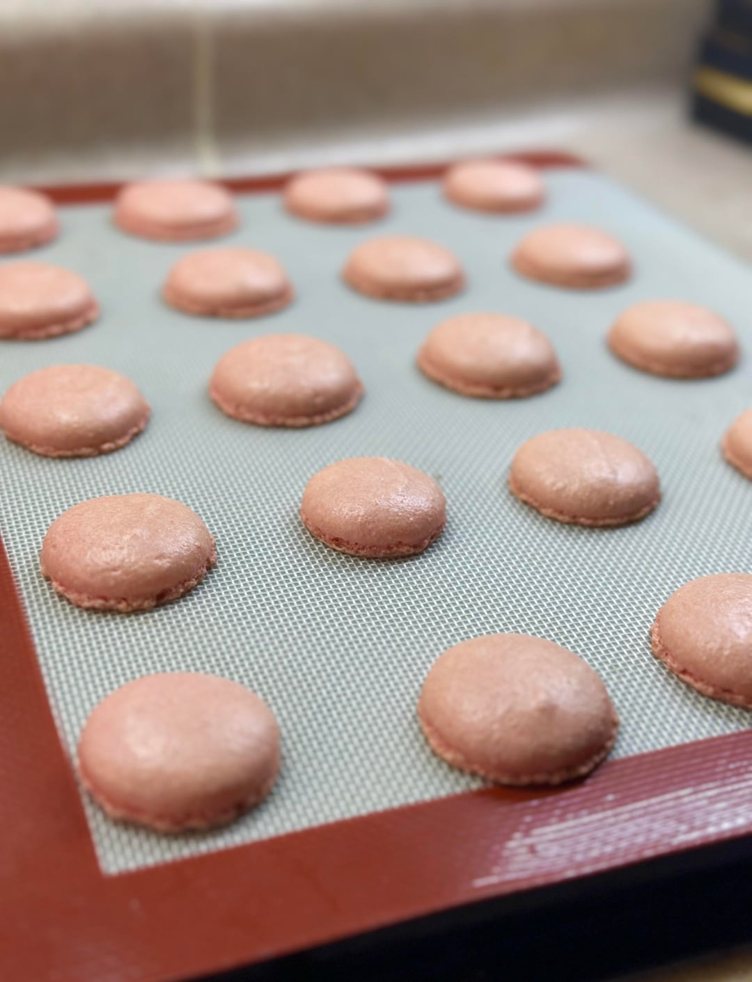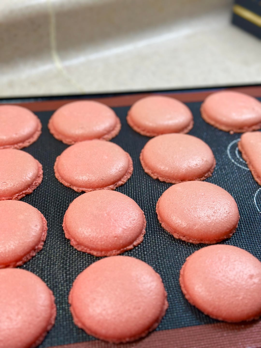 Recipe 50g egg whites 50g sugar 60g almond flour 60g powdered sugar Baked at 300f (150c)by WalkSilly1 1 Comment Kaidalexis 1 month ago Usually feet spreading means overmixed macronage but can also be a meringue stability issues as well where the weak meringue causes the cookie structure to collapse