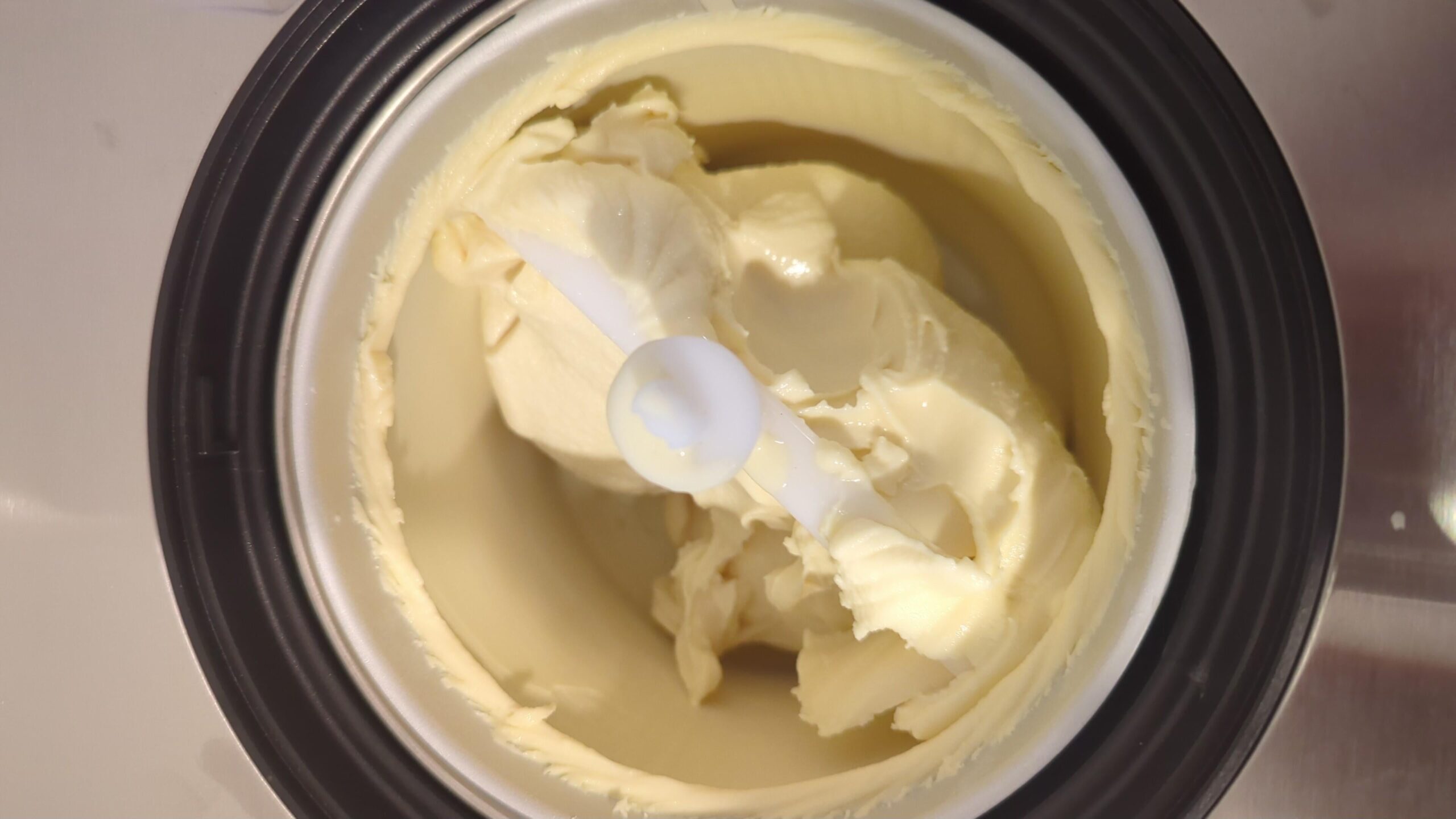 My first batch of ice cream! It's a custard base, I used Dana Cree's recipe. The flavoring is my homemade vanilla extract made with bourbon.