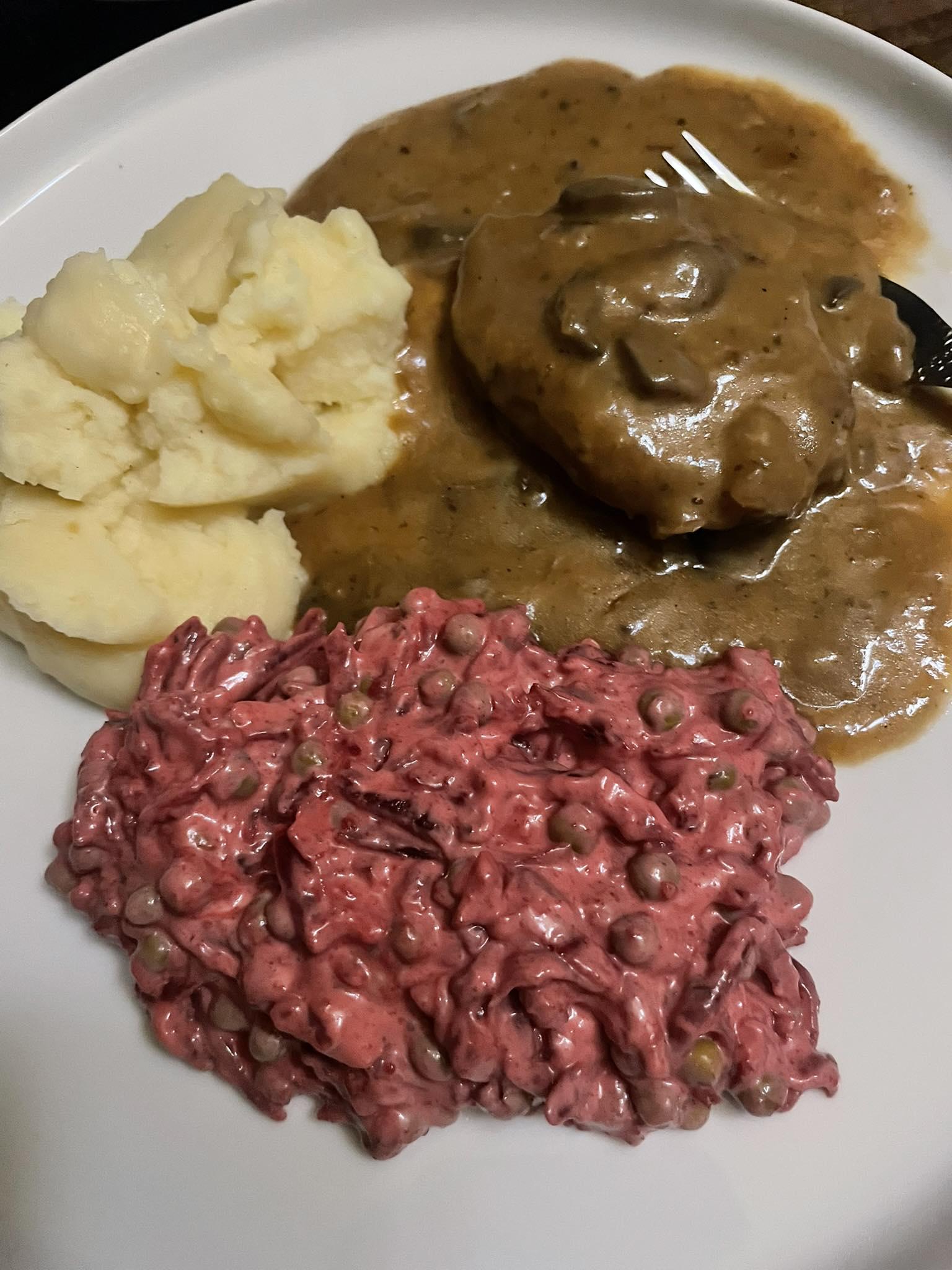 Peas, beets, and sour cream… with sauerkraut? Im thinks there is something to add to that texture.